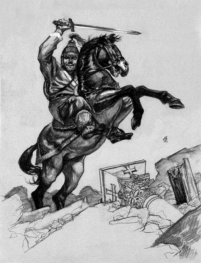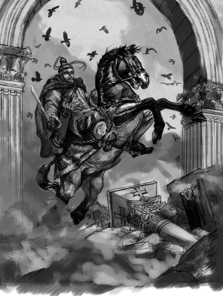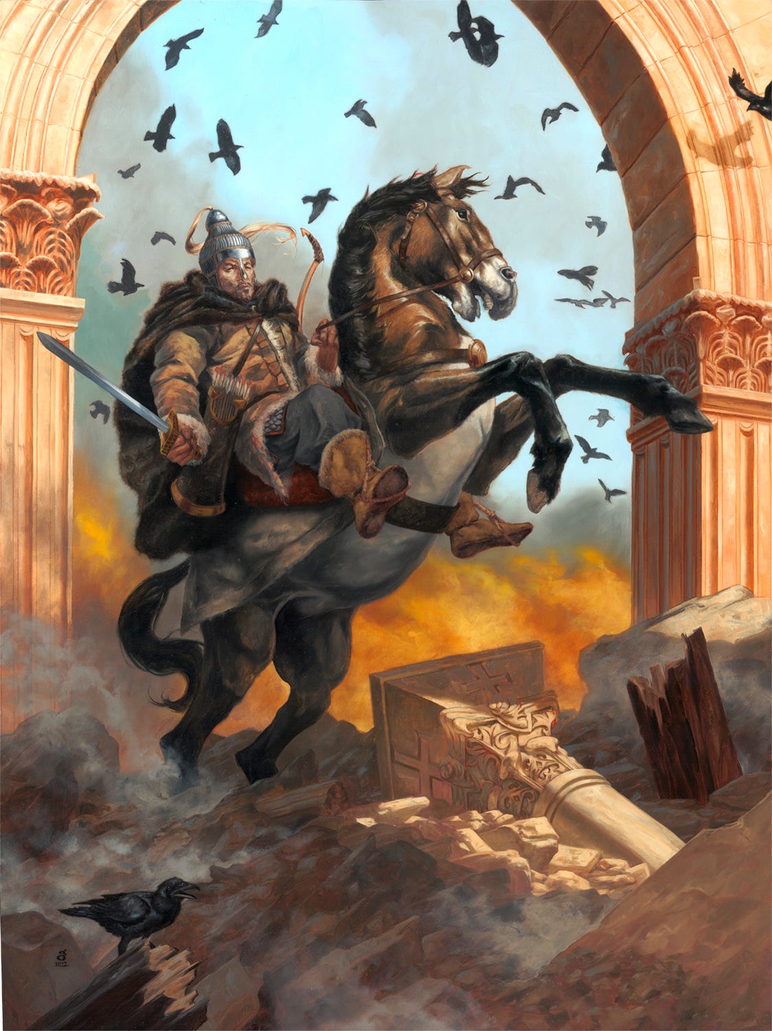 For his horse, I sought out some native breeds and settled on Przewalskis, which have lovely coloring and a slightly unusual shape. As Attila was known as, “The Scourge of God,” in his time for his army’s fierce combating and destruction, I placed him within the ruins of a church or cathedral of some kind. Crows added a bit more narrative and doom to the image.
