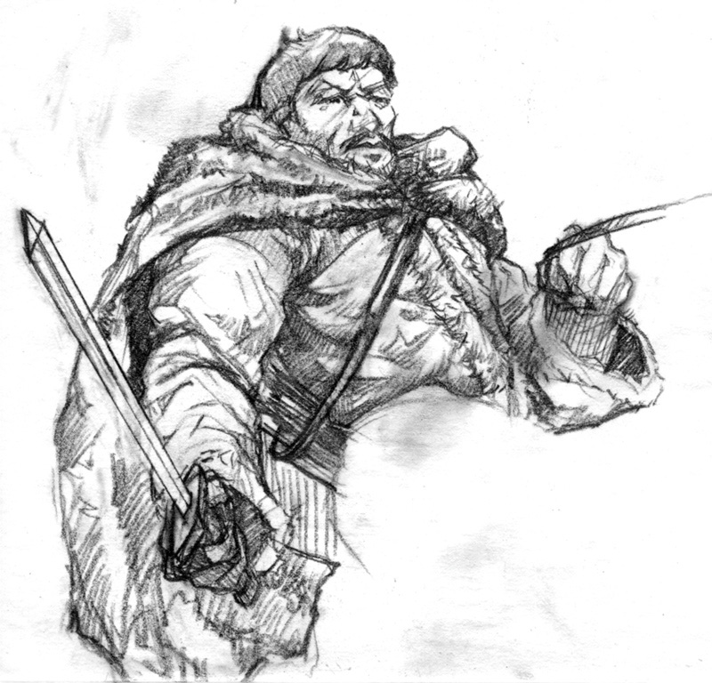 When doing more historical works, an illustrator runs into a problem. Within gaming and the like, it’s not like historical stuff necessarily pays any more than usual. But the prep-work for a historical piece is considerable, before one even begins thumbnailing. And it all depends of course on how detailed one wants to get. If this were National Geographic, it’d have a whole other caliber of research on top of this, but their budgets are bigger, too. The go-to for illustrators are Osprey Books’ Men at Arms series, many illustrated by the late Angus McBride. And yeah, they covered these groups, too. It’s decent, but I was finding info and small details slightly at odds with it through other research. When I did, I favored the research I had done. I took for granted the intermingling of cultures, the ransacking of enemies and so on, so there’s a hodgepodge of sources, some of which might be stretching it here and there. But then, this is also a fantasy illustration. The pose itself was requested to hearken back to David’s famous portrait of Napoleon, which dictated the overall mood.
