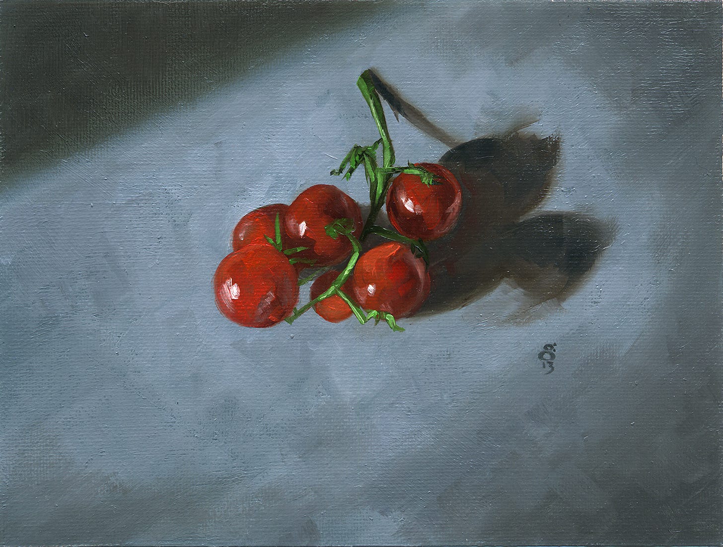 It’s interesting looking back at some of these simple experiments, after-hours, with no expectations that I need show them. Here, I had taken a sheet of gray canson paper and taped it to the wall. I used thin sewing needles to tack this bunch of small tomatoes to it, and then played a bit with lighting. Then I painted it, trying to make them actual-sized on the canvas.