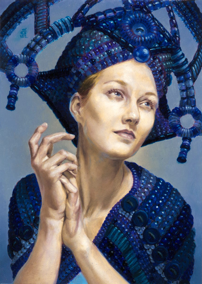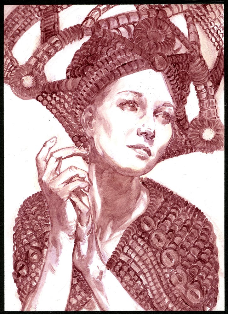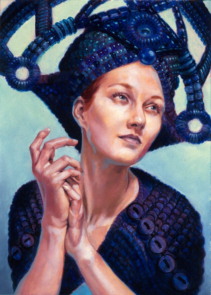 A few months later I pulled it out again and worked on it some more. Immediately I was unhappy with the value structure, which was too focused on the filigree in the headdress, too stark. So I repainted the background, and then did a little more work on the skin tones to adjust. Then it went back in the drawer for awhile longer, since I was working on it in and around projects still. The next time I had an opportunity, I pulled it out and just finished up the beads finally.