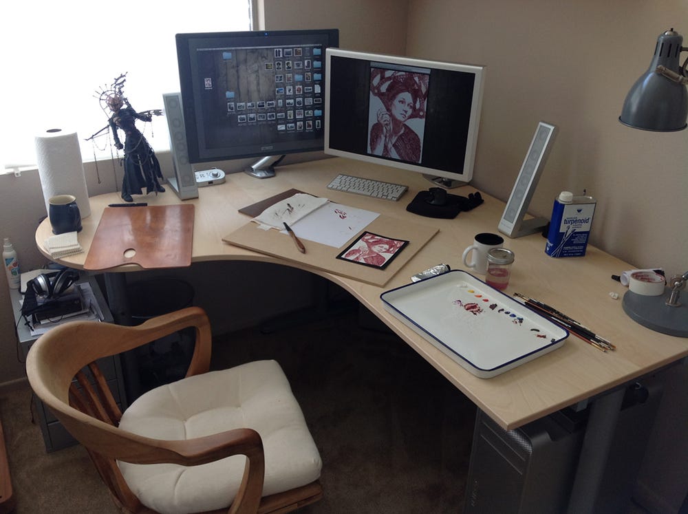 I hadn’t done any preliminary drawing or anything, and this piece moved quickly and almost effortlessly. It was probably due to the great time I was having. I arrived in SoCal, and within a couple of hours sat down, borrowed Ben’s paints, set out my reference and got to work, with Ben working alongside me on his own piece. Eschewing my usual methods, I just started doing the drawing straight with paint, skipping the pencil stage entirely. Within just a few hours I had a mostly finished underpainting rendered in Mars Violet, and then it was time for dinner with artists Daren Bader and Tom Baxa, who came over to Ben’s and had a look-see at what we were doing. Later that night we got back to work and I finished up the underpainting.