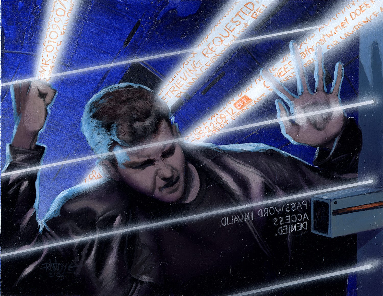 Assigned as Security Grid Optimization, this was an attempt at visualizing Cyberspace, the data network in visible form, in a sense. I conceived it as visual streams of text flowing along beams of light. Here, the data continues past a gate of sorts which has closed, keeping this hacker out. His hands are pressed to the invisible barrier as if against glass.