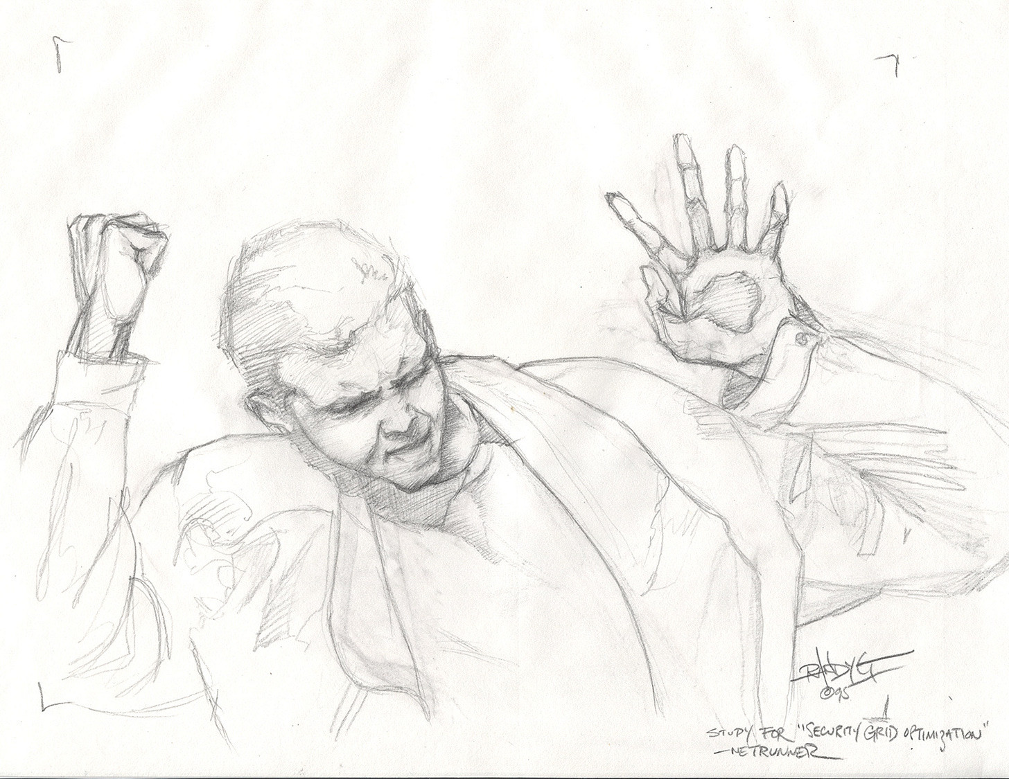 In 1995, I was 20 and still lived in my parents’ home. I shared a spare bedroom as a studio with my older brother, who was studying Graphic Design at the same time I was in school to be an illustrator. He didn’t go on to a career in the arts, but it was fun working on projects side-by-side when our paths crossed in the studio. Because he was around, I roped him in to model for this piece. He actually modeled for two illustrations for me, and incidentally they were both for Netrunner.