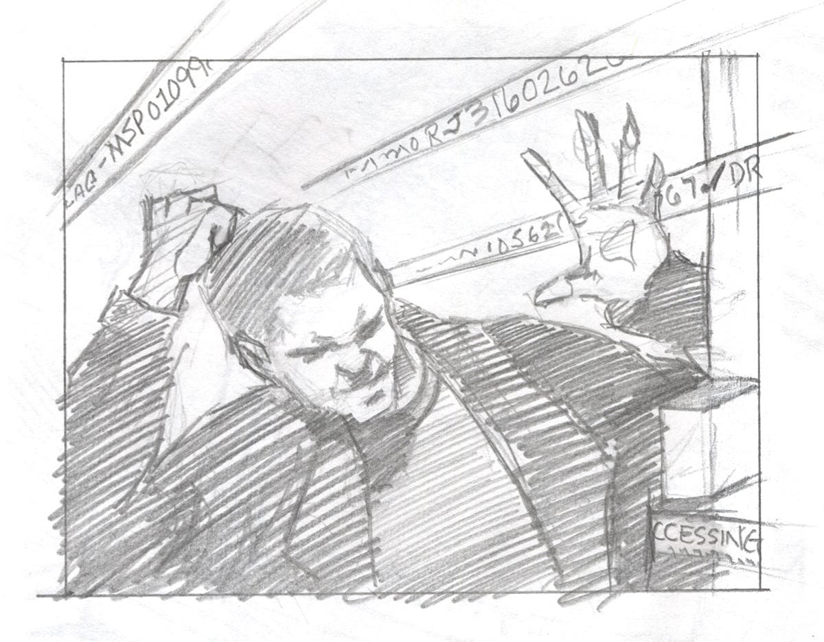 This is an occasion where the rough actually had an improvement over the final. The hand in the rough is a shorthand drawing but indicates that his fingertips are flattened against the barrier more than in the final drawing, which seems to carry some awkward posing anomalies likely present in the polaroid—an occasion where being too attached to your reference can be a detriment. In the posing, his hands pressed tightly against the glass was probably also smooshing the skin around in weird ways, like when you see a picture of a cat sitting on a glass table, from below. It translates weirdly.
