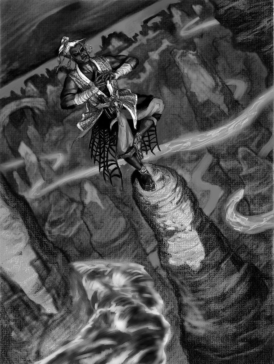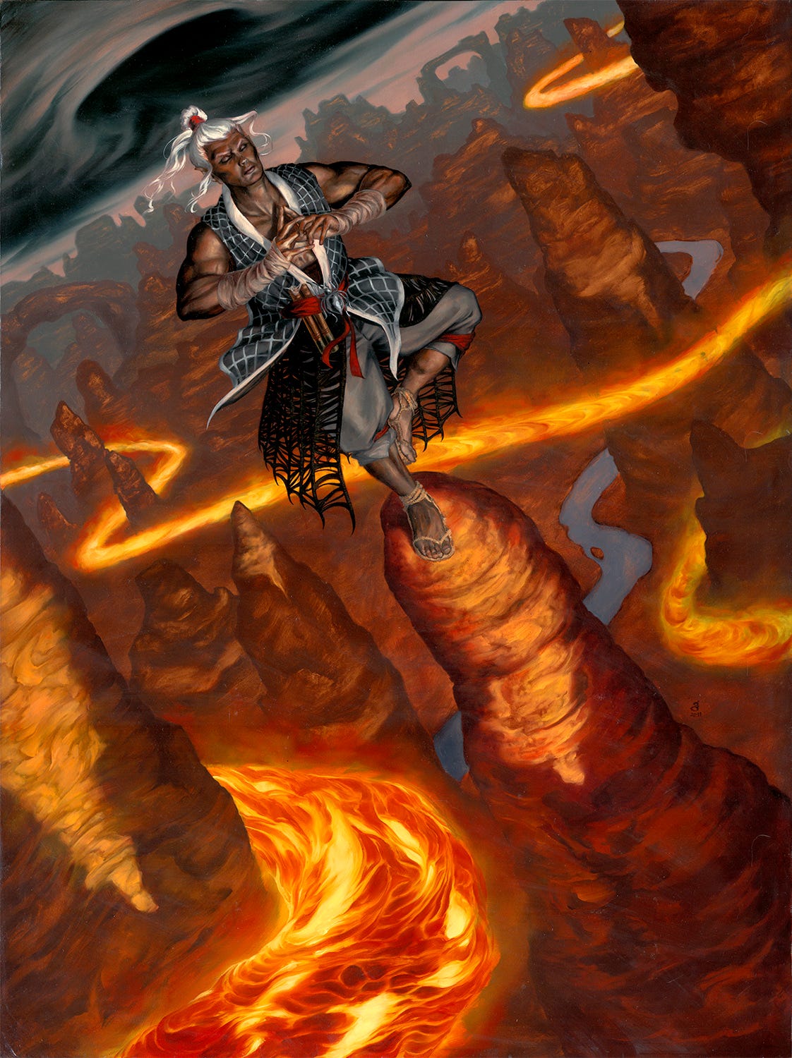 A good AD is a collaborative partner. My first sketch consisted of this same charcoal study, with that roiling inverse-funnel in the sky, but not so much in the way of lava. The monk was also an older character, a wizened old figure. I thought he might be a little too old, and Mari Kolkowsky my AD agreed. She also suggested the floating lava flows. In the end, those suggestions really helped the piece snap together into something better. I redrew the figure, composited things together digitally, got the ok, and went to work!