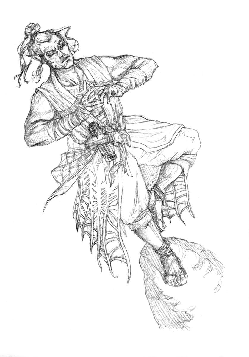 It was also a rare opportunity to paint a character from the game’s renowned Drow race. In this case, I was to portray a monk-type of Drow, meditating on top of a cliff or bluff or something, in a landscape that could be like a western USA rocky landscape (Pinnacles National Monument, for instance), magicked-up.