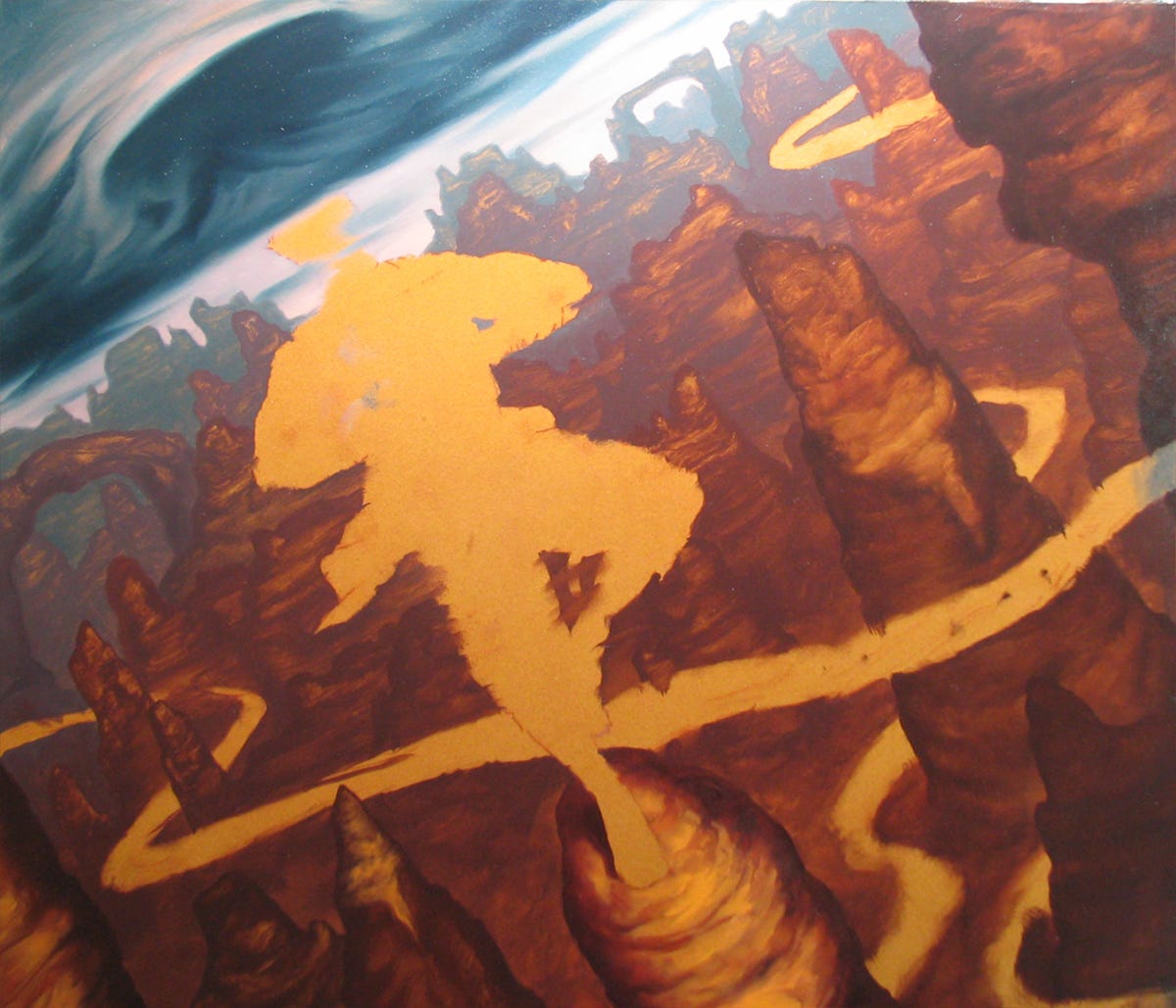 For pieces like this, it’s quite natural to paint distant-to-near, in terms of the overlapping forms, which is what I did. I recalibrated the value study from what’s above here. If you squint at the final, you’ll notice that the shadow area for almost all of it except for in the 3 forward most pinnacles is basically the same value. I think the most distant areas are maybe 15% darker or so. That’s a really narrow band of value to play with, and it was meant so that the complexity of so many overlapping forms would not complete with the figure, which it’s starting to do in the sketch. To push the atmospheric perspective, then, I relied on graying out the color as it proceeds back, and collapsing the dark-to-light spread, so the light areas get successively brighter as you get nearer. It was a challenge to restrain myself to that short a band of variation of light-and-dark with so many forms to render. But I was happy with the results. In the nearest area, I pop more darks and lights to really separate it from the mass of the rest of the landscape.