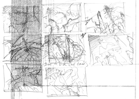 It’s a little funny, looking back, that for those two thumbnails in particular, they immediately trigger in my mind the finished pieces. I can see in my head just what they would’ve looked like. Not so much the others. In that sense there are two more paintings on this theme which may end up staying in my mind forever, with no reason to get them out now that the job is done. That upper right one still calls to me—perhaps it’s a case where one day I may be able to repurpose the thumbnail.