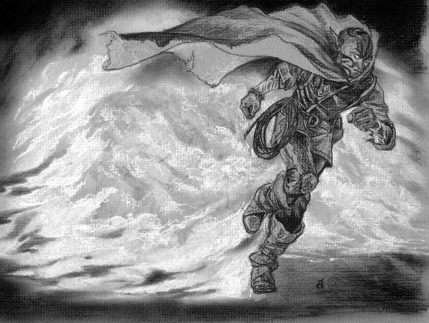 One can notice that the Monk is covered in tattoos, and I chose to have these tattoos begin to glow as they reach his extremities. One can conclude his legs likely have similar tattoos glowing as he leaves flames behind in his foot path, but I was asked to have the flames more explicitly coming off his body in the final, where they curl up his legs as well.