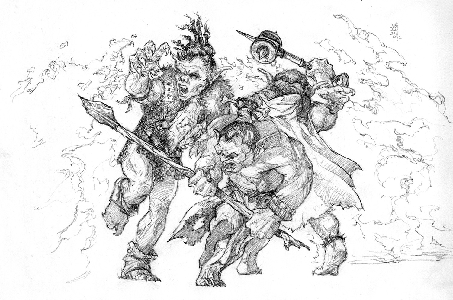 In composing a piece like this, where the goblins would necessarily be obscured by flames in part, I reasoned correctly that the odds of some changes would be high enough that it would be worth drawing them separately then compositing them, so that if I had to re-pose any, it wouldn’t be as onerous as if I’d drawn the whole composition as one thing.