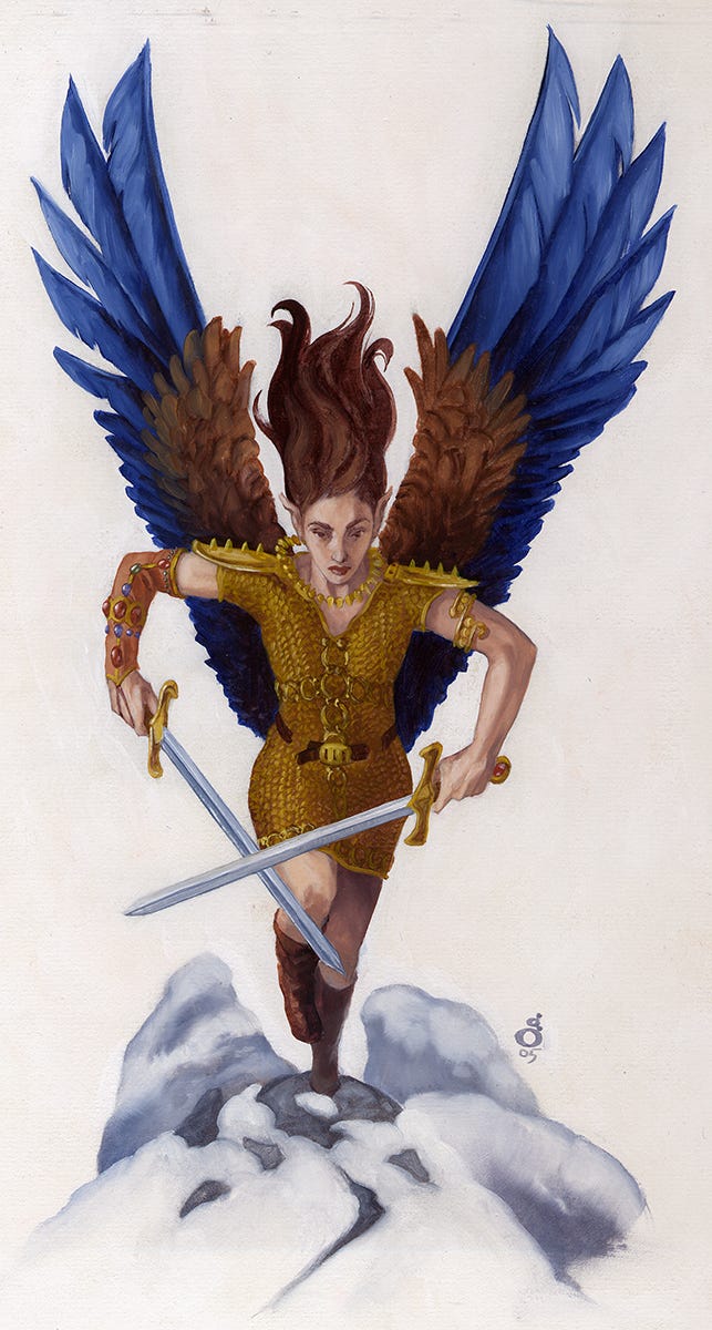 The Winged Elf piece has the Elf sort of launching into the air. Probably I needed a more from-above camera angle than I chose, to emphasize the foreshortening better. This was something I noted afterwards back then, so it’s always been harder to enjoy it. The Cultist was definitely the more successful of the two.