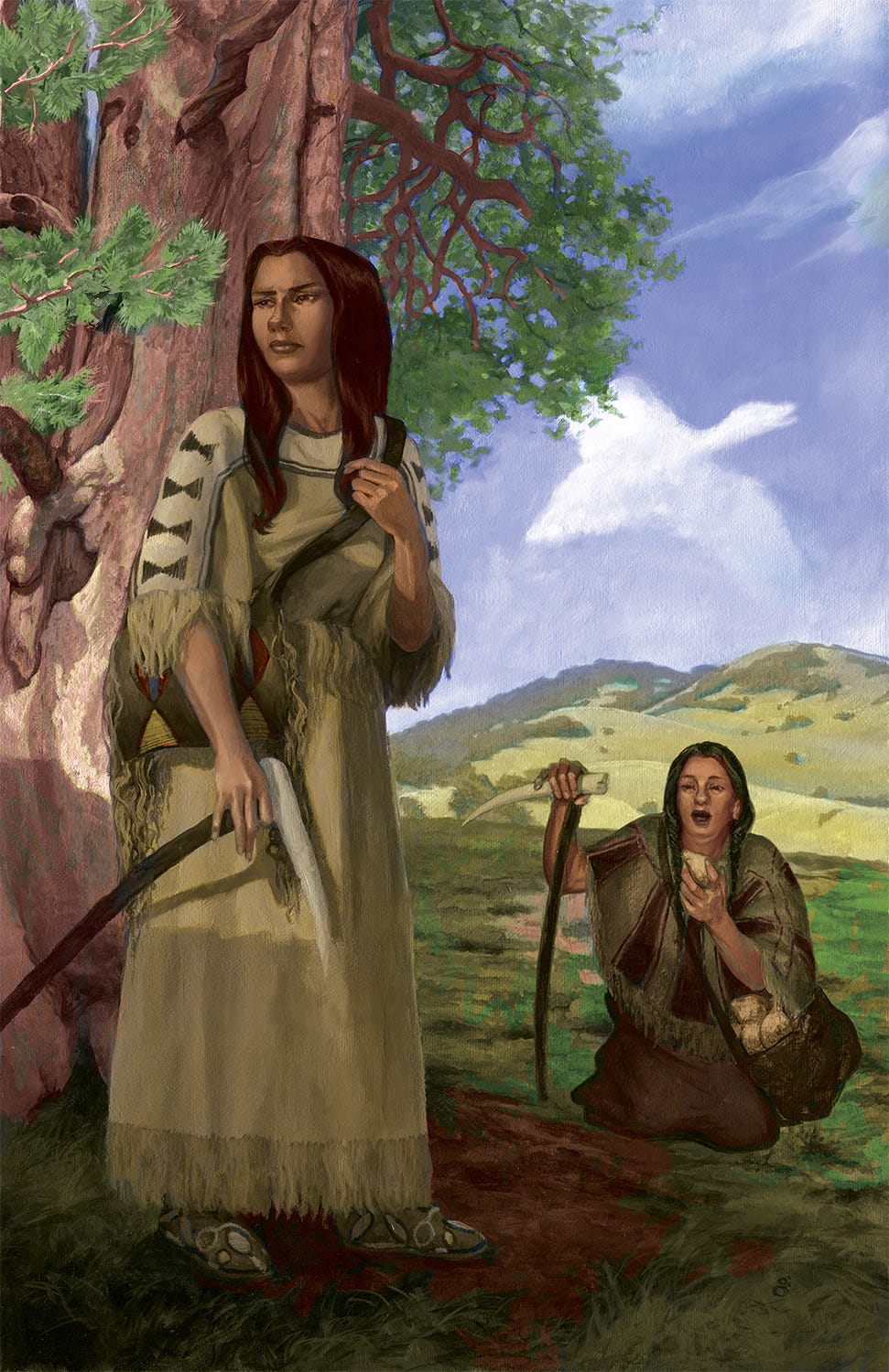 For Arrow, which was a smaller-budget project, trying to think of these ways to economize was the mother of invention. The paintings were mostly smaller, but I did choose the opening illustration as one where I would stretch out a bit. Here the protagonist is daydreaming instead of gathering with her older relative—the details escape me, they were gathering some roots or tubers or something. She is daydreaming about being a hunter, not a gatherer, which forms the main conflict of the short story.
