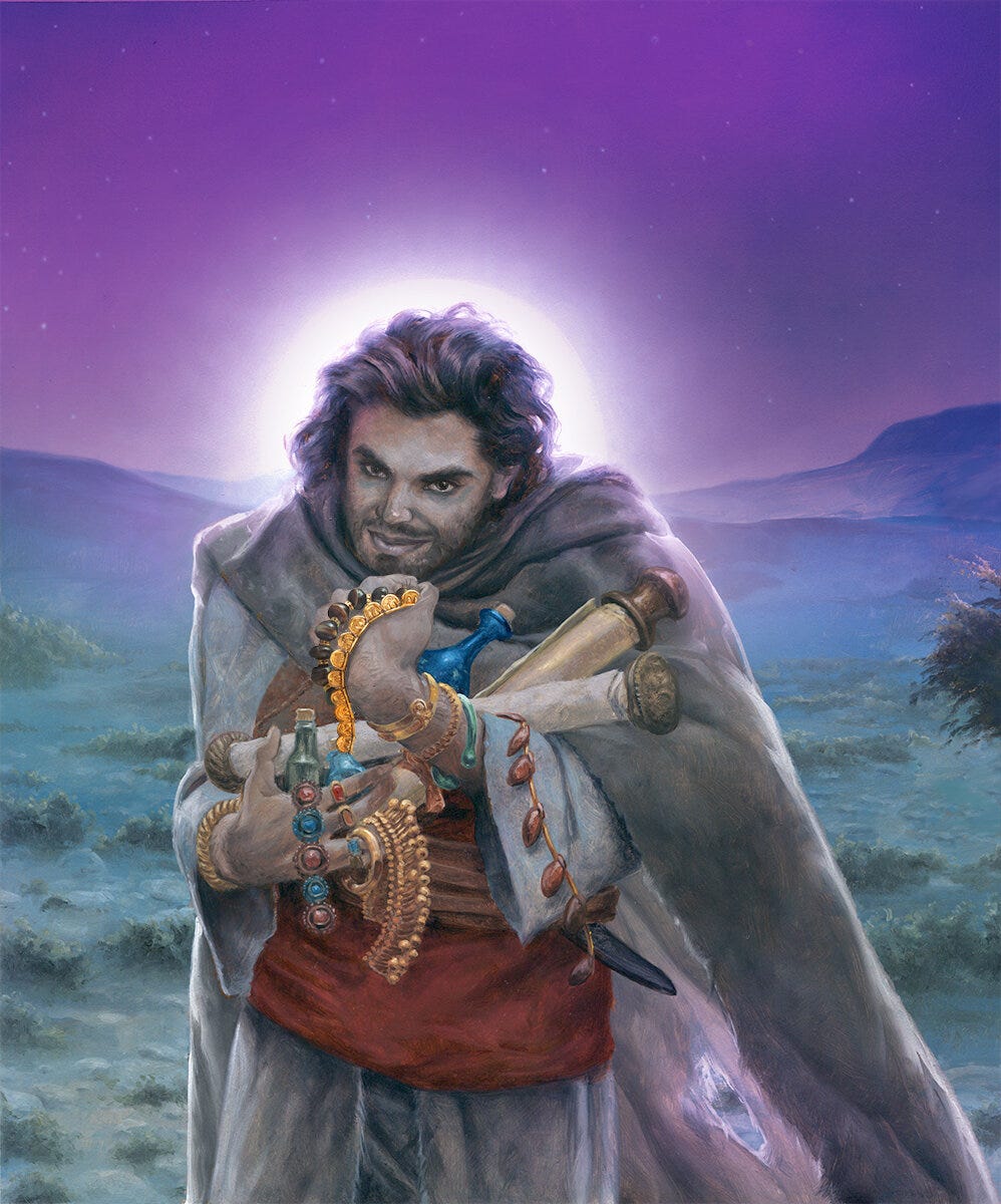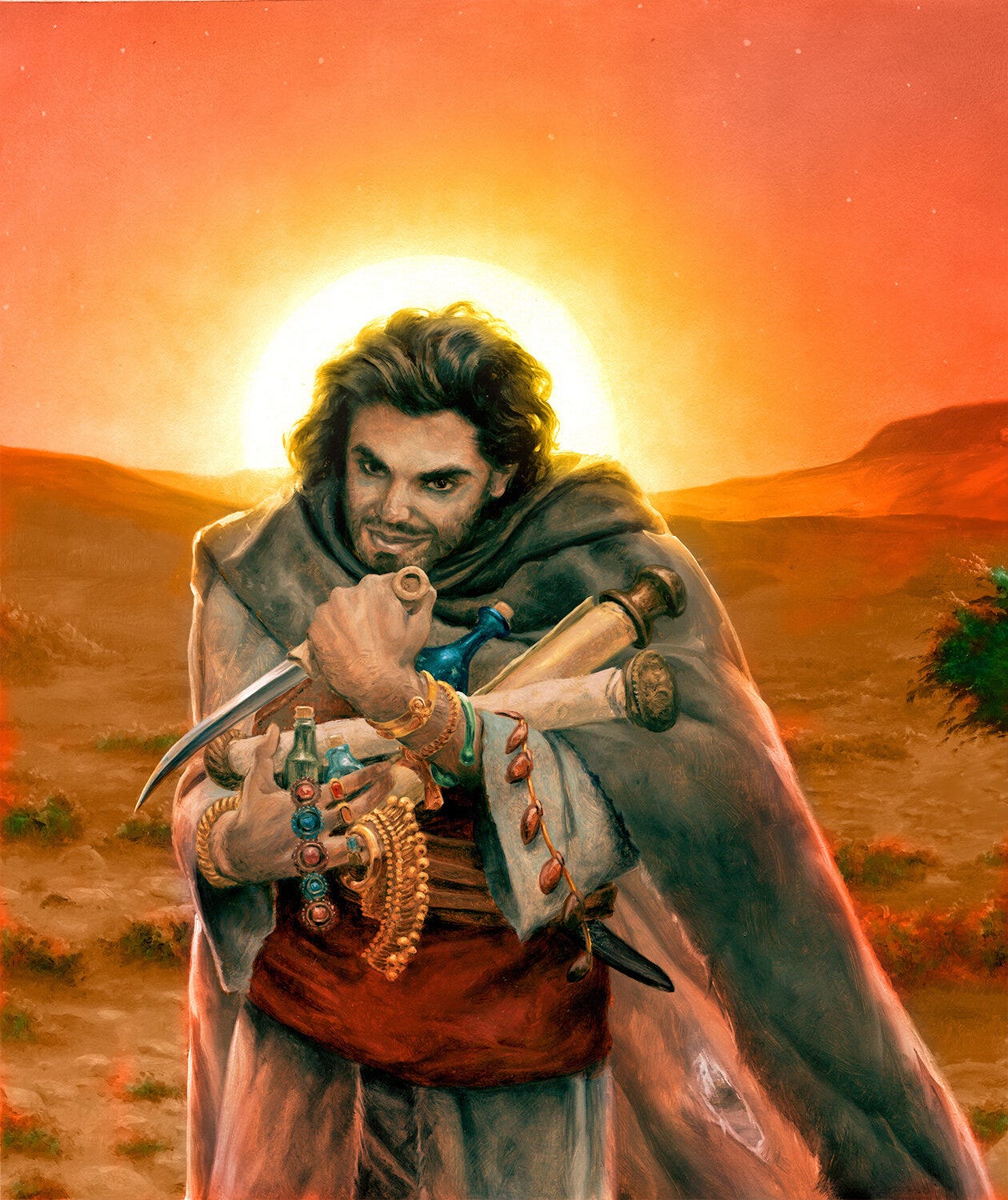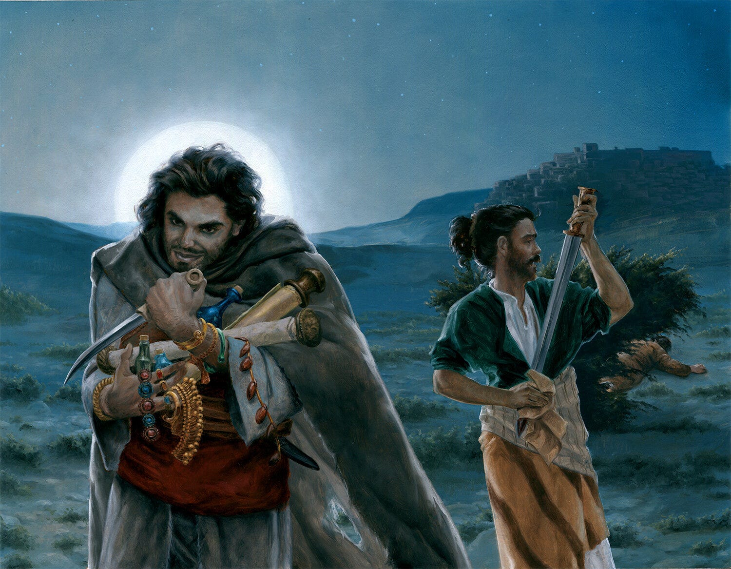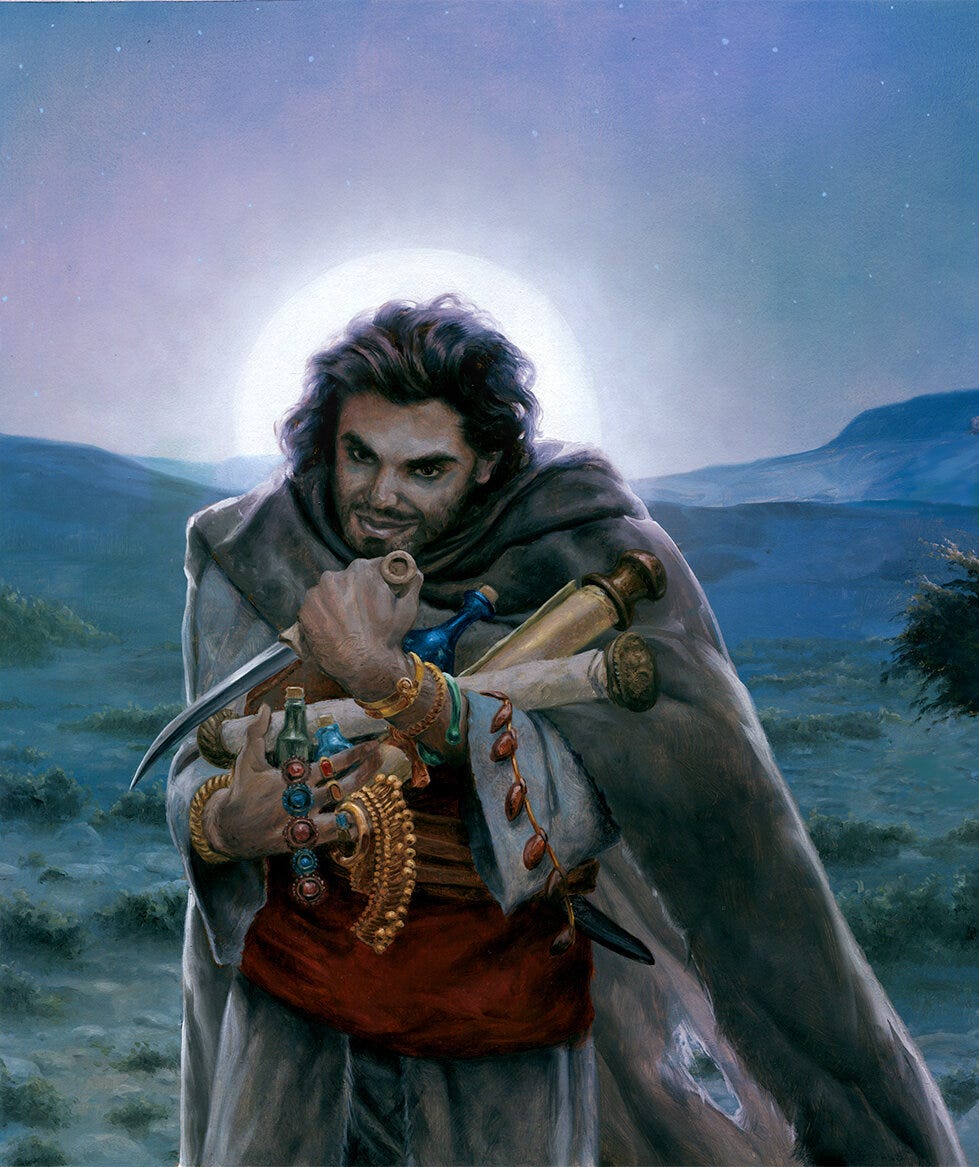This then was the cover as it was first submitted. It was among the first spreads finished so they could do their cover work, and I continued with other parts of the book. I then heard that the buyers were not very thrilled to have Dismas holding a knife on the cover, and thought the cover needed more color. To be honest, I kinda thought so too—that’s part of why I had recommended a sunset from the start. Shifting it to moonlight necessarily reduced the breadth of color.