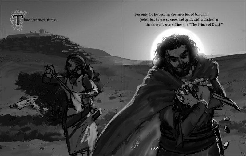 The third spread, however, introduces Dismas as an adult, after a few pages of his boyhood, where he was being trained up in his evil ways as a street urchin under the sway of a criminal named Gestas. This spread’s words were few, and it gave me a potential for a more simple portrait-type scene, and was our best bet. We were under another very tight deadline, and though I would have preferred to recommend a standalone illustration that would only be used on the cover, to free us from needing to re-use an interior, there was no time in this marathon, and this was a decent option.