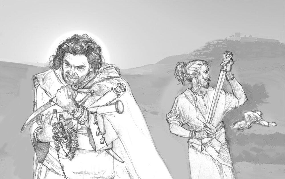 It was Carolyn actually who recommended flipping the illustration, which was a great idea, as it put Dismas’ first adult appearance right under the sad, terse sentence, “Time hardened Dismas.” I had other reasons to compose it as I did, but her instincts were correct, I think.