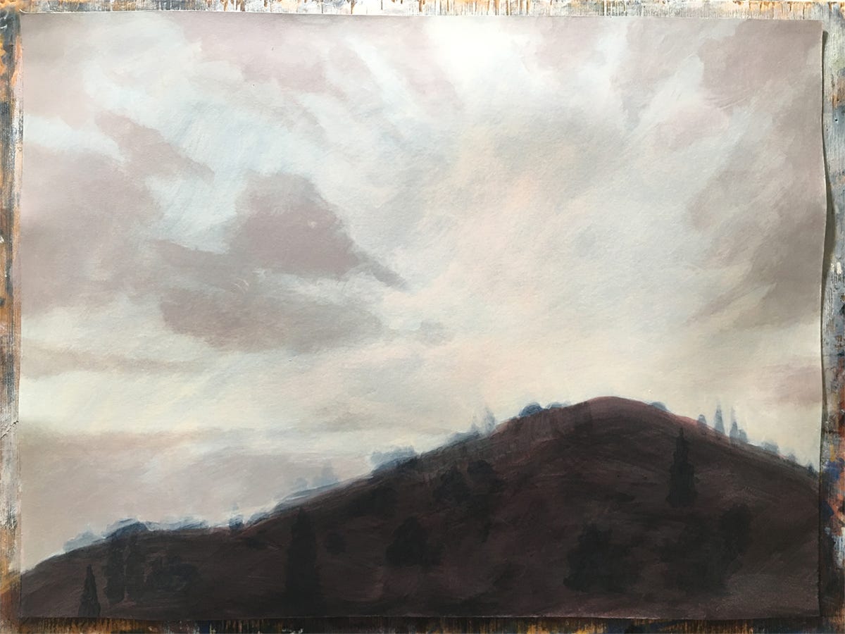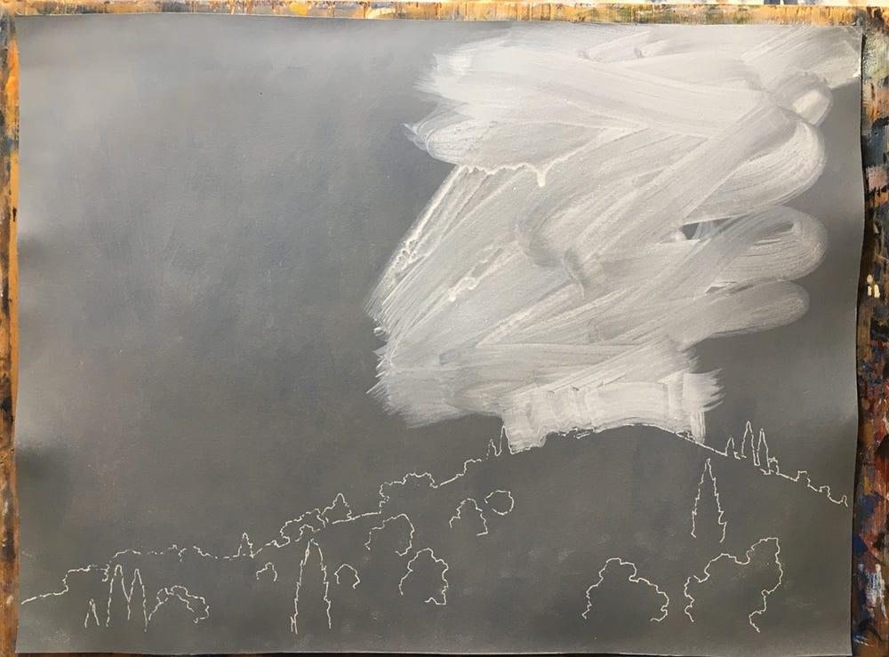 I had hastily sketched out some of the foreground elements in white pastel pencil and here I am using probably gesso white to begin to knock back the sky. You might ask why I started with a gray toned sheet versus default white, and that would be a fair question. It’s possible that I had extra primed sheets that weren’t used for whatever reason (the cover ended up being larger, and on illustration board, for instance). It’s also possible that I preferred knocking back the gray to white, thinking that the gray would help more in the shadowed hillside and for the clouds that remained.