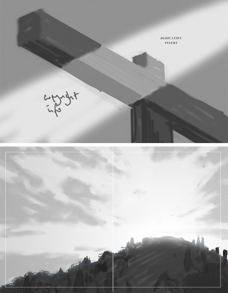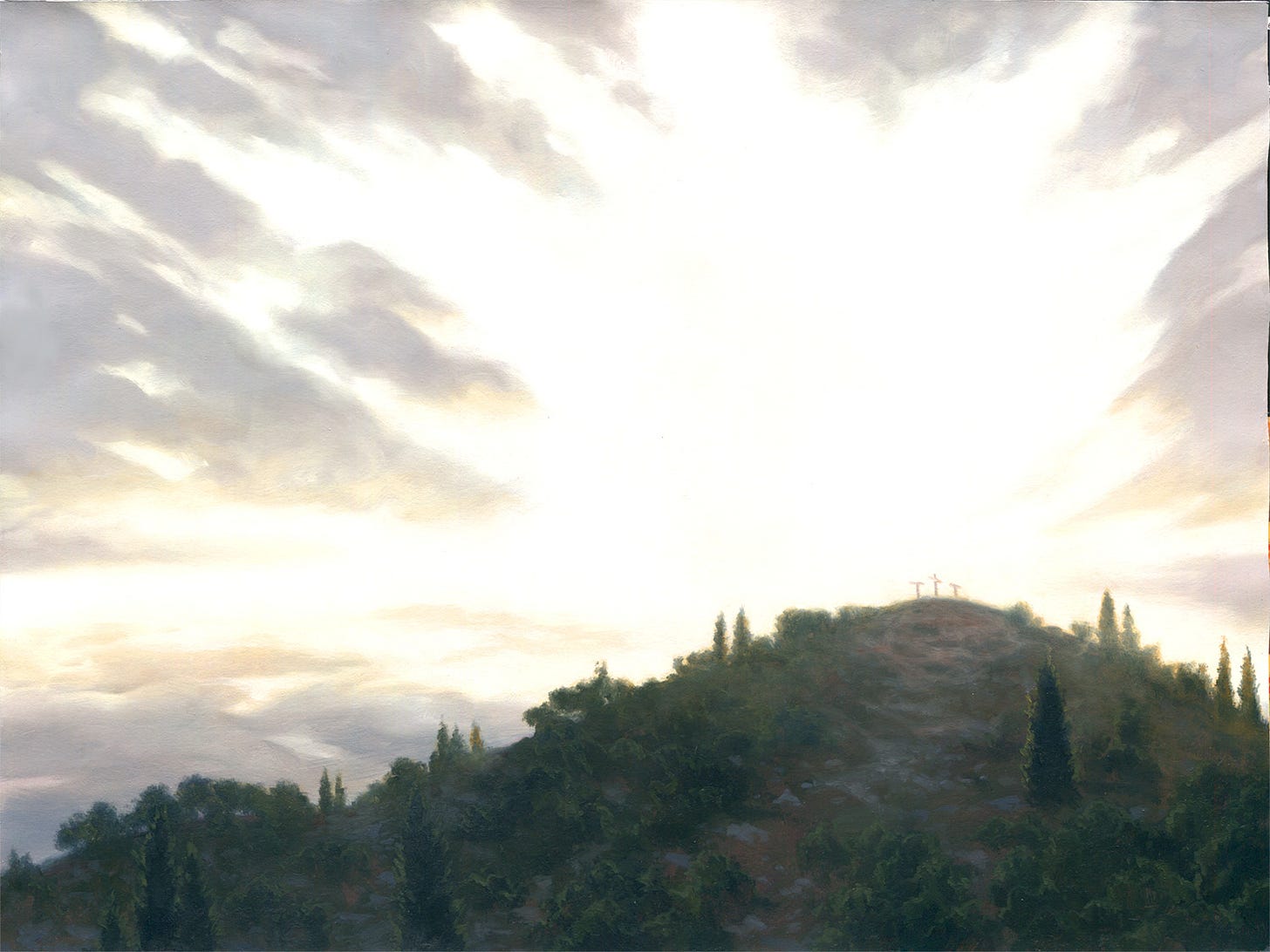 As you can see, it is absolutely minimal. Probably the background would’ve just been gray clouds. I thought the split page composition allowed for two nice text blocks for the necessary typography. I think the idea was nixed just on not introducing this imagery at the front of the book, since it features prominently in the back third. Fair enough. I decided to send them the second thumbnail, a simple scene of Golgotha as a bright dawn breaks over it. I don’t see them there, but I think the intent was always to have the three crosses tiny on top.