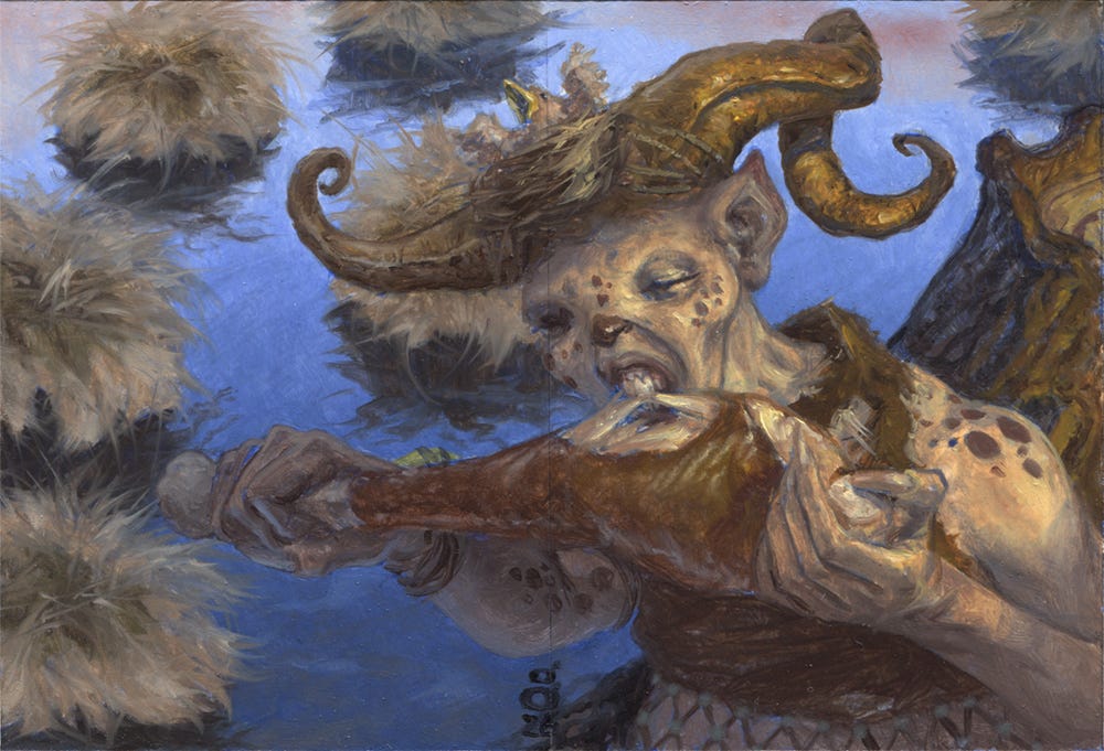The image here was painted across two cards, Boggart Trawler and Boggart Bog (which are a flip-card, in game, but printed as separate artist proofs). This image was featured in this month’s livestream. You can see the replay here.
