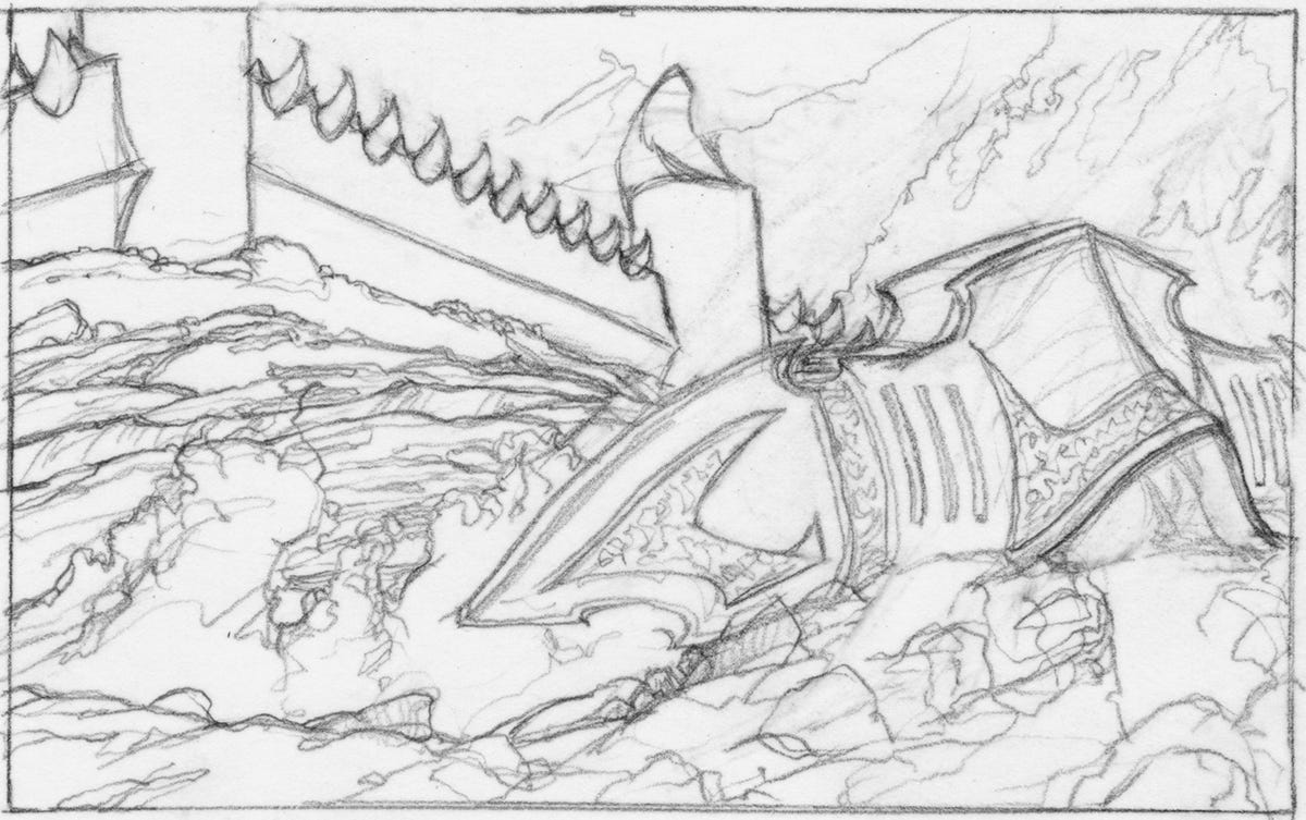 When I can, even if I’m going to render a digital finish, I like to start with an actual pencil sketch that I scan and continue working on digitally. I’ve occasionally done the drawing digitally, and sometimes have had to, but it’s still the case that I just don’t like the feel of drawing on a screen. I don’t like the feel of painting on a screen, either, but drawing feels much worse.