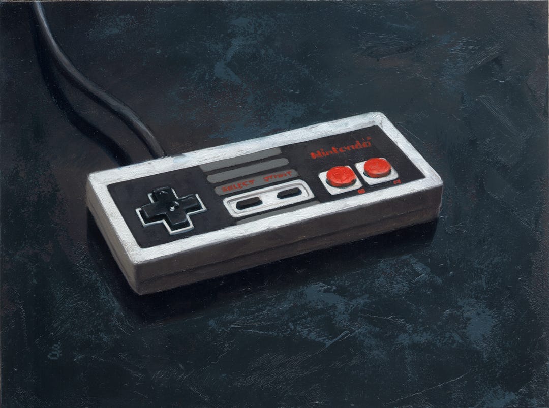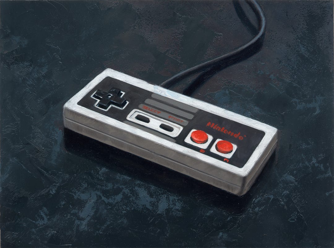 In painting the console and its two identical controllers—because one rule I’ve had is to always paint as many controllers as were allowed by the hardware—I knew that there were a few other pieces from this generation that I’d have to paint. And I did paint the Zapper lightgun later. But as for the last 3 pieces, it’s taken me 11 years to circle back to them, in part because I didn’t want this hardware to dominate the series, as it dominated the landscape of the era.