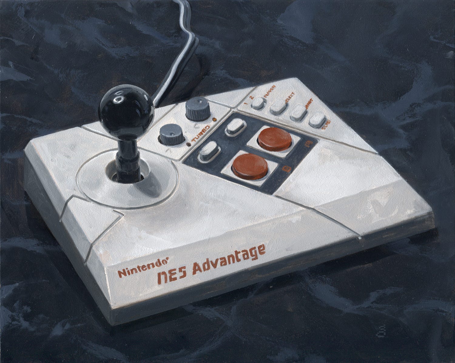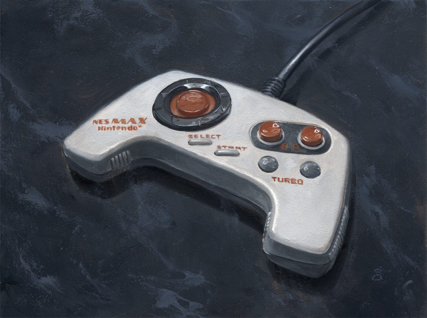 While intending to finish my suite of NES paintings (the last being done in 2016) for years, it was thanks to a fan that I finally got moving. A few years back, I acquired a complete R.O.B., which has been sitting dutifully behind me as I type since then, mocking me for my inattention to it. A couple years back, I also picked up an Advantage joystick. I had one left to get, as I wanted to do the last three together. That was the MAX controller. We’ll cover R.O.B. separately and focus on the controllers as they go together.