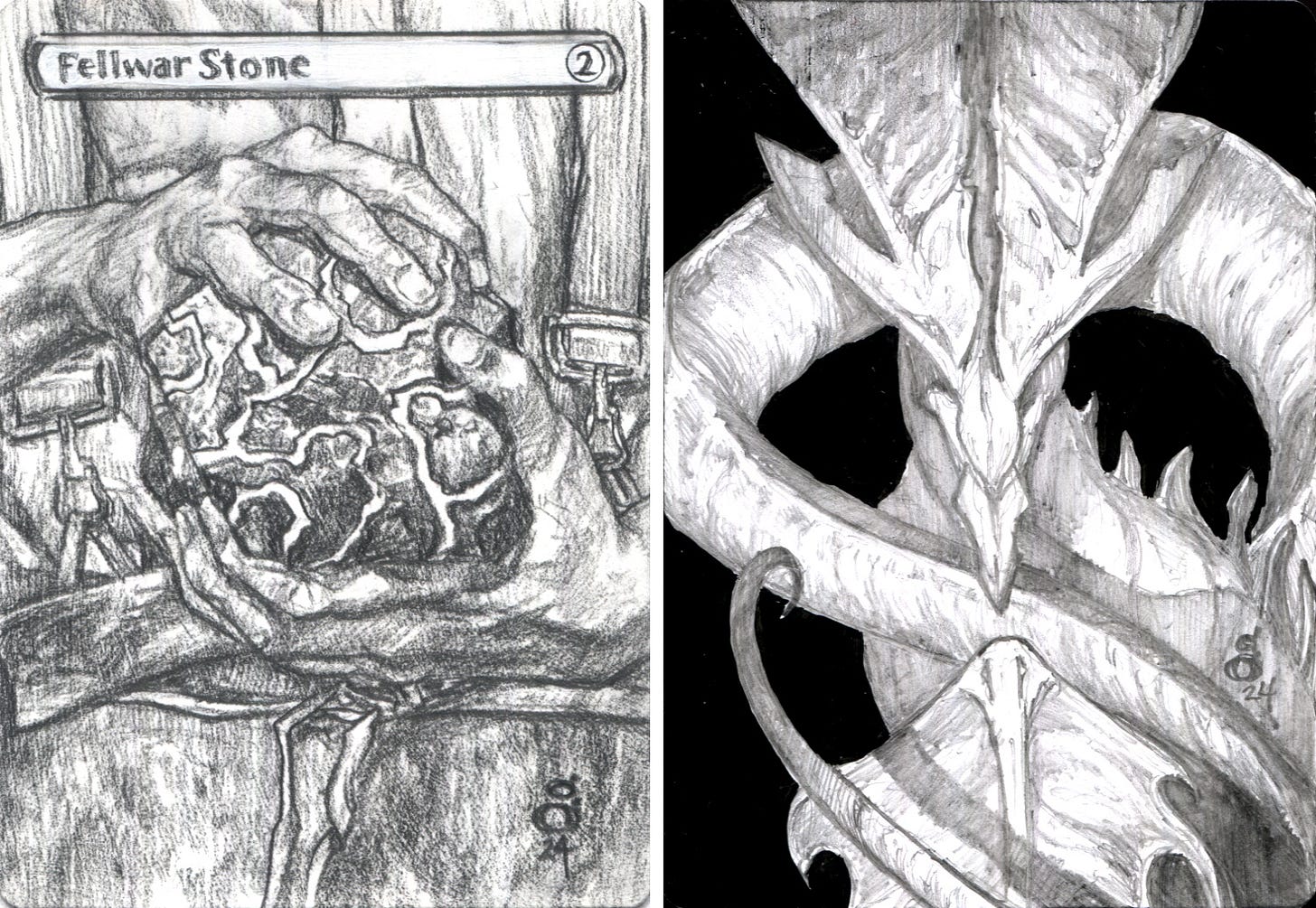 Sketch commissions are rendered in pencil, ink and/or acrylic, and the back of the proof may get a clear primer to facilitate reception of media, especially on newer cards.