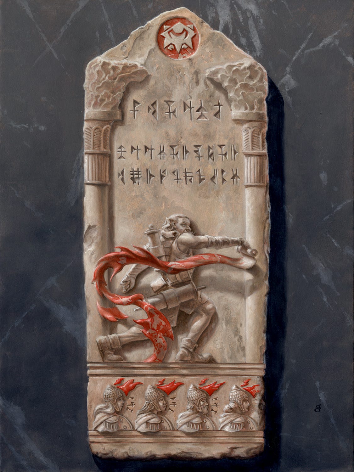 In both of these Strixhaven illustrations, they were sent to Wizards of the Coast as digital preliminary images, using photo textures and such as stand-ins. You can see that the scroll the Orc is holding here, which unfurls into red magic, is very low relief, whereas in the final you can see it was carved deeper, as if you could put a finger behind it in the gap between it and the tablet itself. This was due to the influence of seeing some wonderful examples of medieval and similar European relief sculptures, which sometimes had a surprising amount of depth to them, versus some of the large bas-relief carvings one sees in ancient near-eastern civilizations, which tend to have a shallower profile.