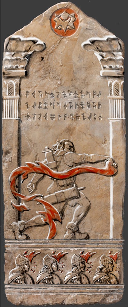 In this case, we are shown a stone tablet engraved and sculpted in low and medium relief. There are hints of parts of it having been painted in red, but it’s begun chipping off in places. Throughout art history, it was surprising to learn that many statues and such that we know as just made of stone, were actually painted, sometimes garishly so. The script carved in here is an in-world variety, but of course says nothing real.