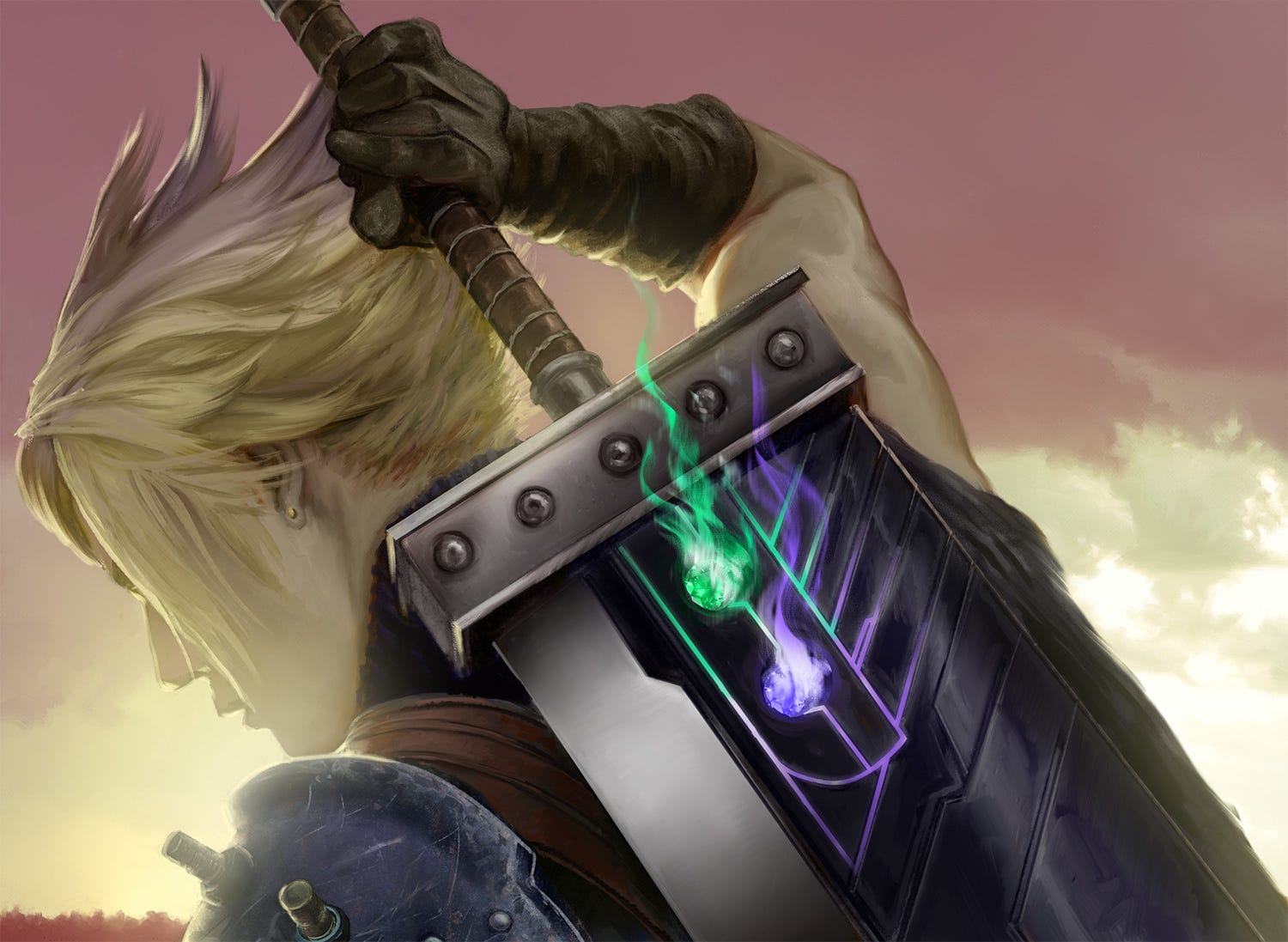 So, I sought to pose Cloud as if he's about to use the Sword, with his face present in the frame but obscured by the light bloom off a brilliant sunset. I was glad they let me get that much of him in-frame, and this made the illustration all the more fun to work on.