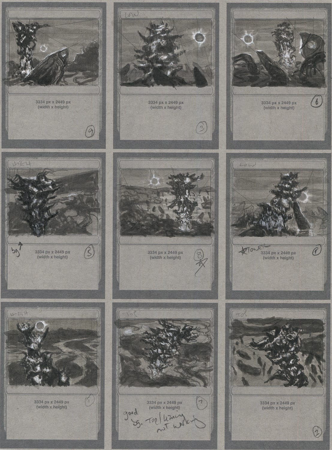 The difficulty here is you have what will amount to a tower all of 1.5” tall, in print. In some cases that other artists have done, you get imposing towers delineated by being, well, tower-like in silhouette, in the distance often. Here, I was to indicate that it was being occupied by fires and lights. But it was all going to be tiny details, regardless. A couple of my thumbnails had more of a top-down view, which would have used perspective to make the part of the tower nearer the viewer larger, but these views did not allow for the tower to look, well, towerful. And while I quite liked the top left and right corners, with the towers being pushed in the distance, the nearer rock formations tended to steal the show a bit.