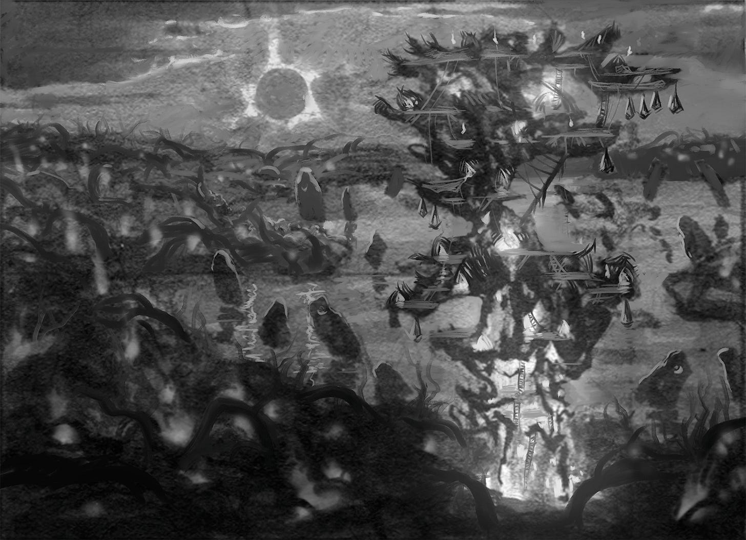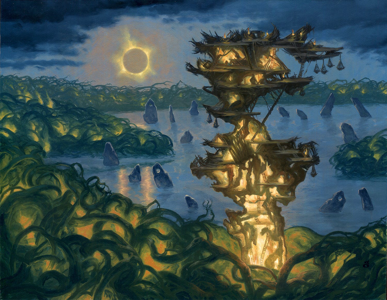 In this case, our environment was on the Shadowmoor side, a world dipped into perpetual twilight, with eclipses and eerie lighting throughout. Our Command Tower here was built within a forest of large, gnarled, bramble-like trees of sorts, itself built with the hallowed out trunks and scraps of wood laying about, by some boggarts or other. This tower was to be overlooking a bay or other body of water.