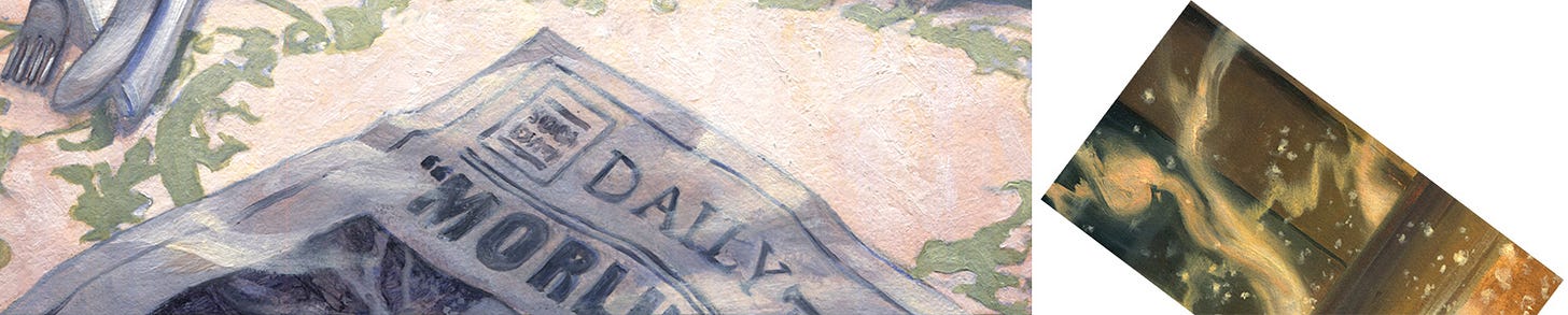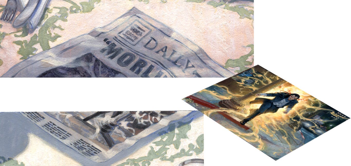 Second, looking at the image above, you can see that I swapped the position of Morlun relative to the street lamp pole in the newspaper shot! I do recall painting in the newspaper freehand, upside-down. I didn’t sketch it and then paint it—I had the shape of the newspaper overall and then just went in with paint and recreated the bottom corner of the Morlun illustration in one go. Funny enough, that light pole has a stronger cast shadow than in Morlun’s actual illustration, as well. Further, I should have included columns of text to the right to make the newspaper wider at the bottom, since when you match up the parts, there’s no room for the word, “Bugle,” in the masthead! It’s an Easter Egg and a blooper, all in one!