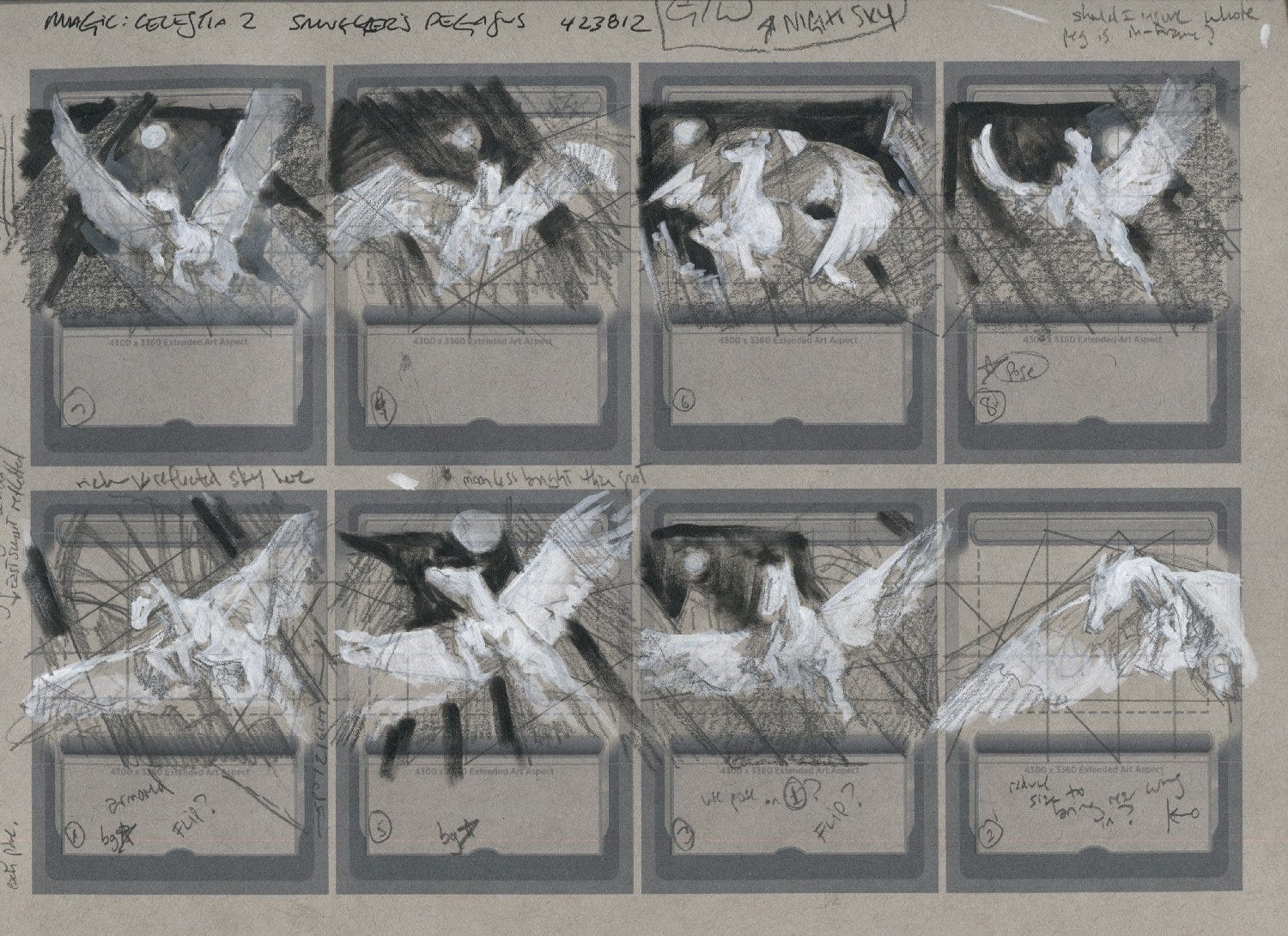 As I started working on these, I was wary that there are only so many good angles to show a pegasus from, and so I went and searched for all the pegasus art done for Magic over the years, and worked to steer away from those same poses.