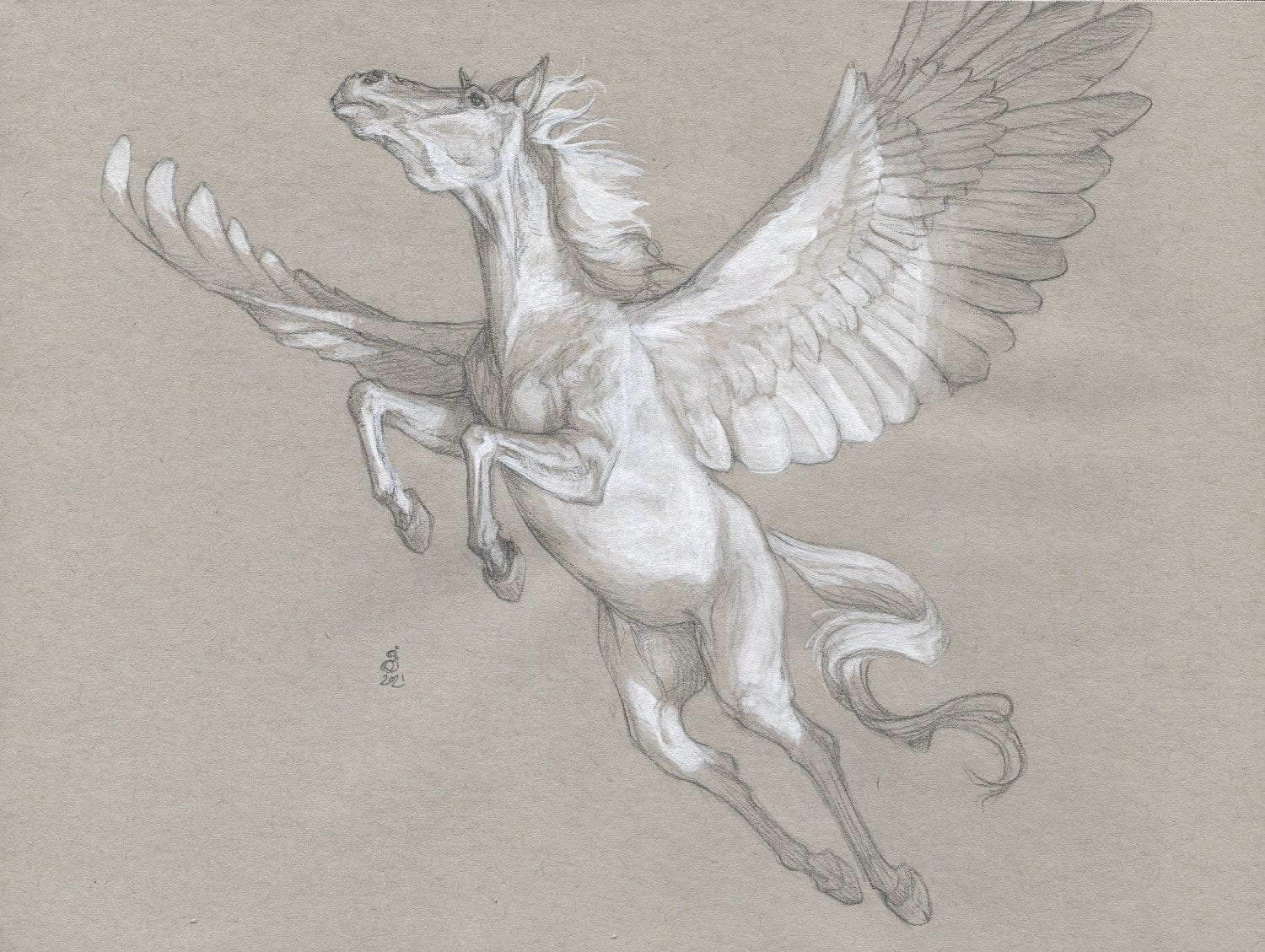 From there I worked up the figure for the pegasus. It was supposed to be armored as well, but at this point I didn’t concern myself with it. I figured I would need some iterations on that, so I decided to do that digitally. From there, I worked up a digital sketch by compositing the drawing above and working up the rest digitally for submission.