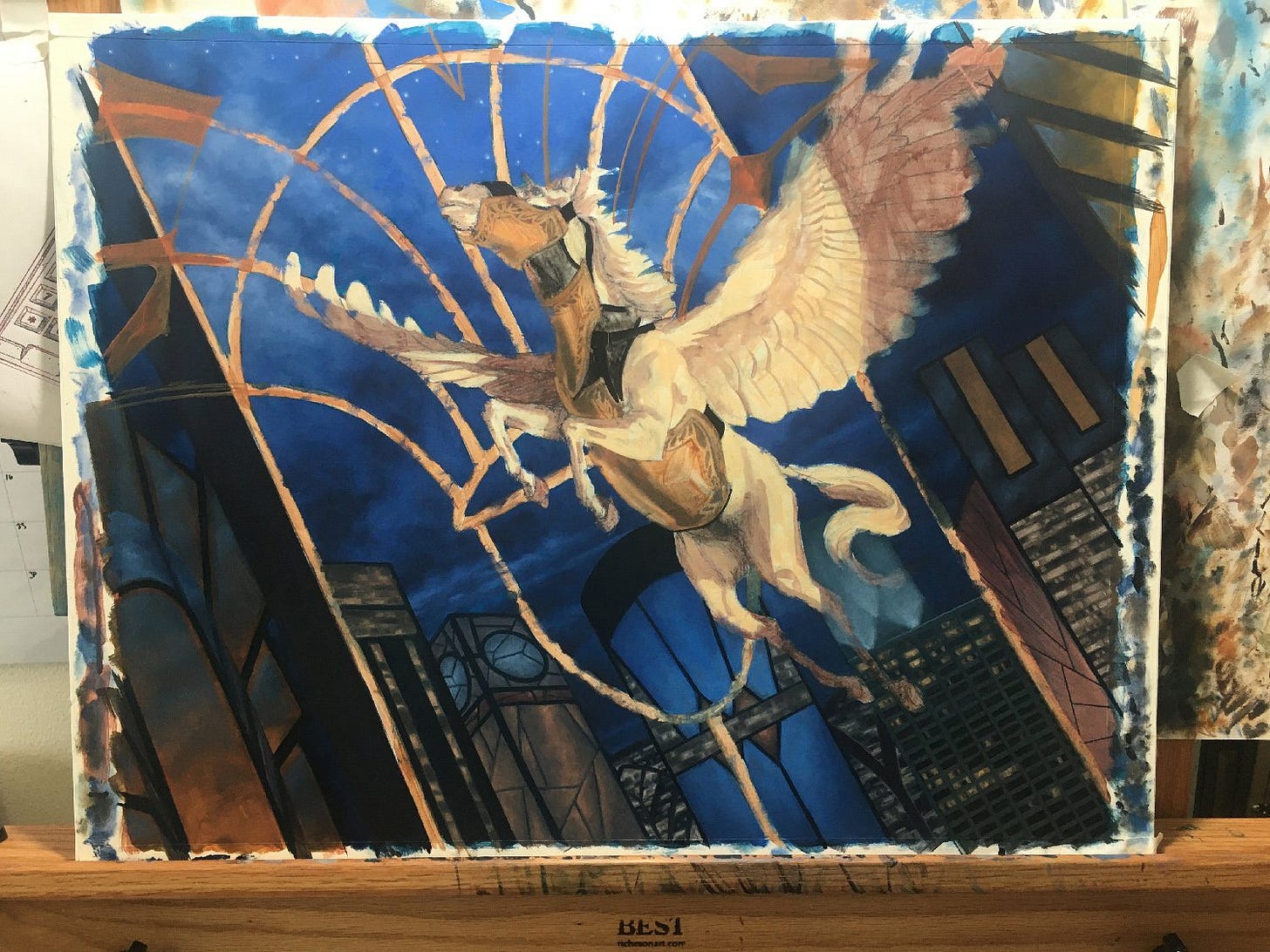 In progress, you can see some of the acrylic underpainting as I’ve begun fleshing out the cityscape in the background, including what’s reflecting in the building.