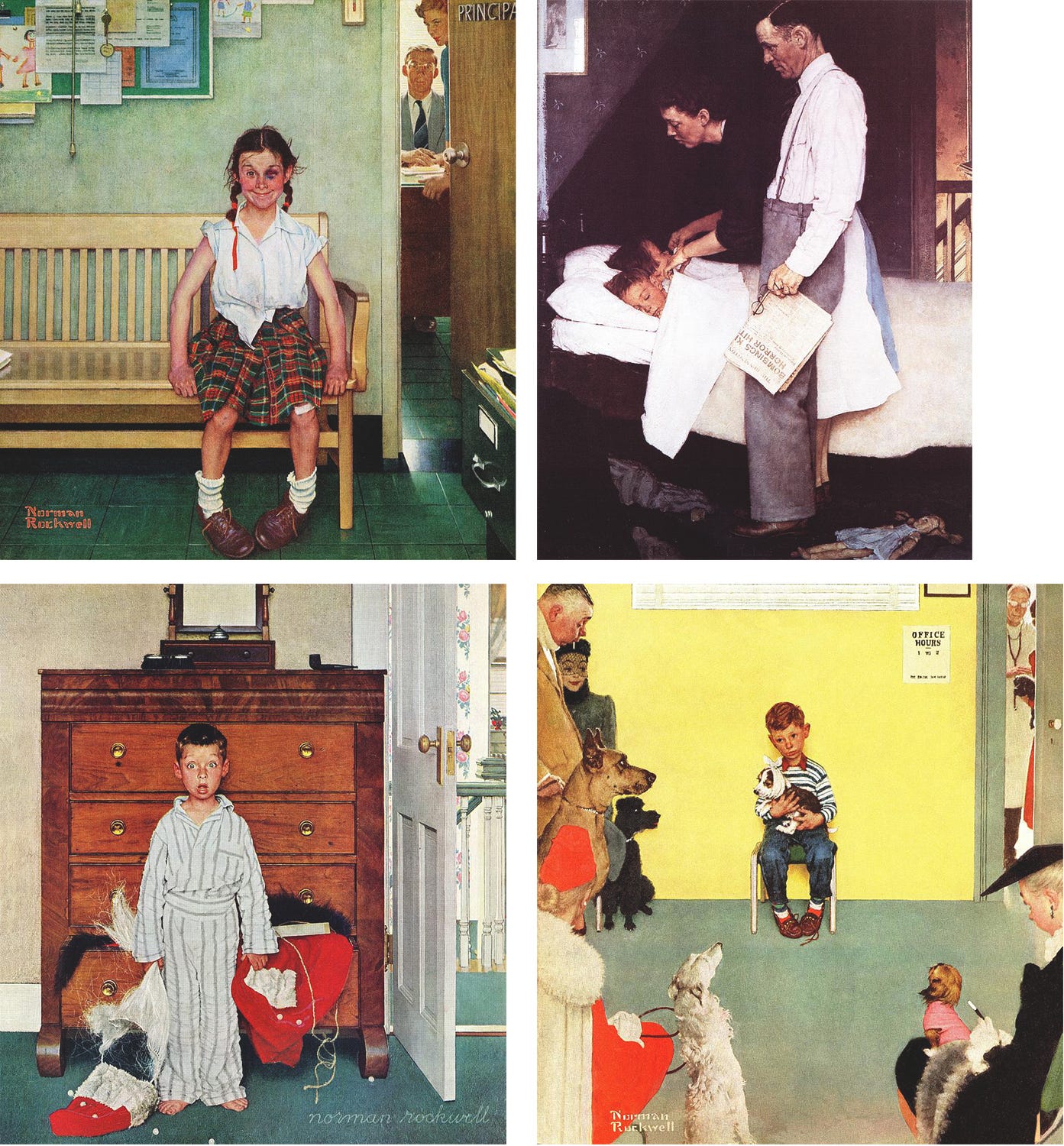 The flip side of Aunt May was an overt Rockwell homage. Here, while it has less of that, I did use a classic Rockwell compositional technique my college teacher Vincent Perez impressed upon me. I call it the shallow escape. There are a number of usually indoor scenes Rockwell illustrated, with very shallow stage depths, often front-on like this as he rarely painted interiors at any angle other than parallel. Because the stage is so shallow, and the walls typically parallel to the viewer, it can flatten out, so he frequently provided a visual escape along the left or right edge, but often the right, particularly if there wasn’t a window to allow the eye a deeper field of vision. Often minimal, it could be an open door way, stairs, a hallway, something that allowed the eye to escape further into the space after beholding the main scene. Placed on the right side as was typical when he used it, it allows our left-to-right scanning eyes to take in the scene and then, “escape,” out the composition. It’s an effective trick, and I utilized it here with the glass panes on the front door, giving you that depth into the yard and garden, also along the right side. Thanks again, Norman!