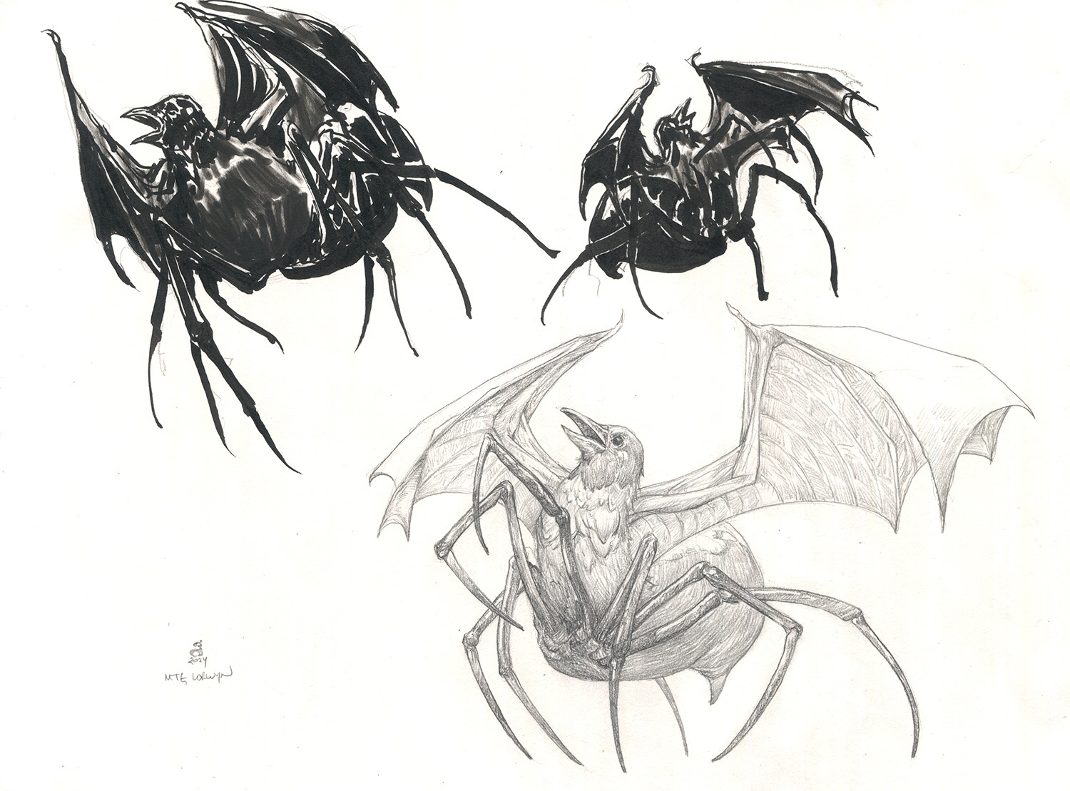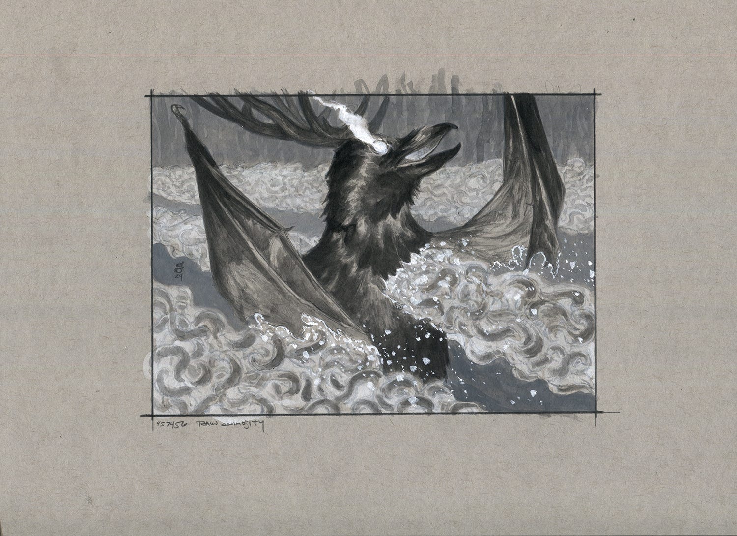 The bird with bat wings went well together. The lower, pencil drawing was the basis of a composition that I abandoned before submitting it. It just wasn’t very good. Thankfully I had a little more time so worked up an alternate. Part of the problem was card size, and that the creature shown above was going to be too small for the disintegration aspect to read well. So I decided to close in on the scene, so much that I’d lose the spider parts, which I kinda liked just on the basis of creepy. I kept the bird and bat, and added antlers, though they admittedly fade into the background a bit. Given that the combo of things was already confusing, I was ok with this happening a little.