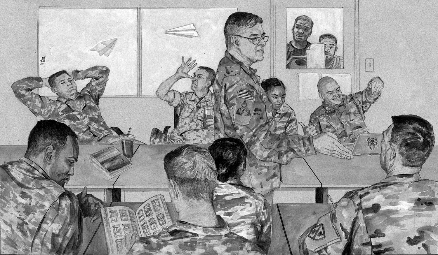 I said that to do this I would need to have photos of the players to work with, preferably in uniform (as that’s what was requested), positioned in their places. Essentially, that they should act out the scene singly or in groups, and photograph it from the perspective of the viewer in the card. They did that perfectly, and included two others not in uniform essentially locked out of class, looking in. Using materials they provided, I created a black-and-white image for them (because color would not have been feasible here).