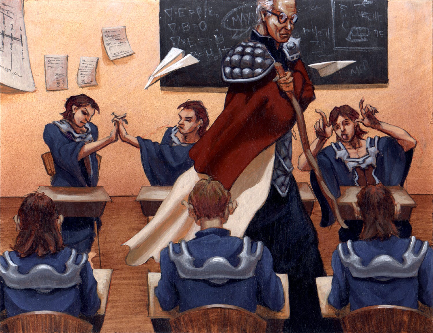Here, our Proctor paces the classroom, where he looks to the students in the foreground, they are angelic, on their best behavior. But as soon as he’s turned his back to the other students in the back row, they become unruly and disruptive. A simple joke. On the chalkboard, on the right, you can see an object drawn, which is the same mechanism or object that is being shrunk down to a tiny scale in the card Attunement, in the same set.