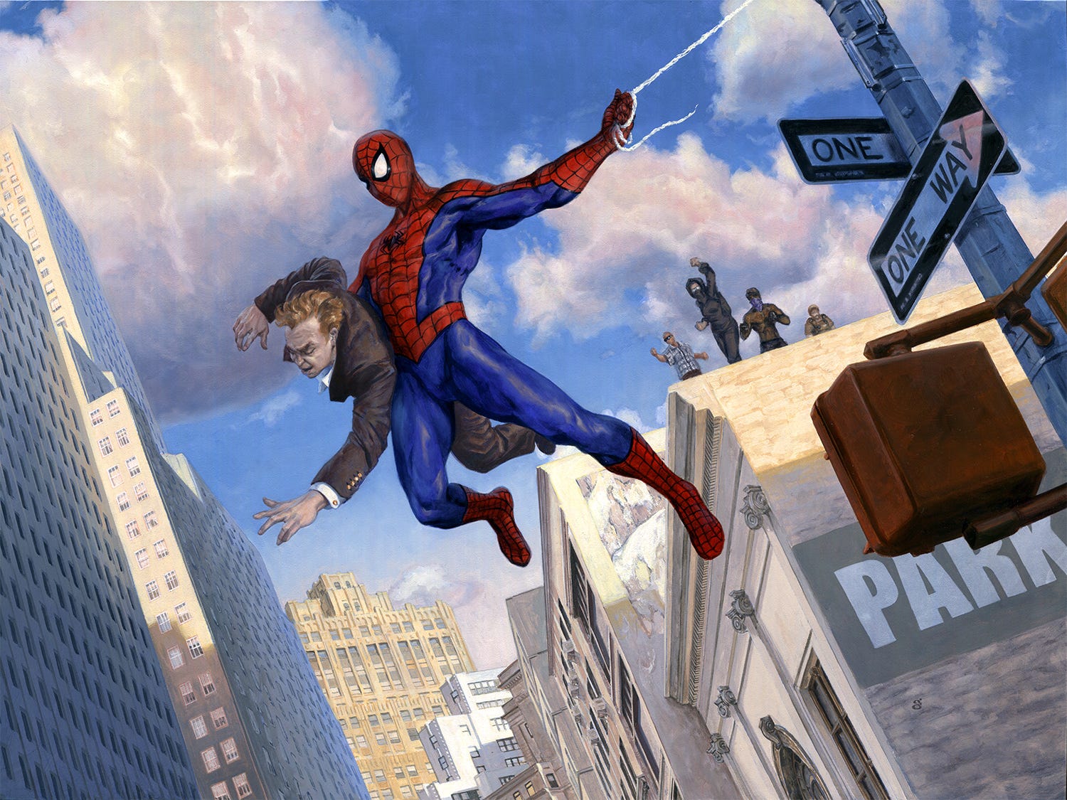 The upside of this illustration was also its downside. I was asked to create a composition inspired by the classic Amazing Fantasy #15 cover by Kirby/Ditko. I was free to update it a bit, and it was fun to do so. Living in NYC provided a lot of reference and feel for this, and all those buildings are NYC buildings, although I deliberately cut up and remixed the locations and placements of buildings, so that I could approximate the overall composition in the comic book, including the tall building on the left and the shorter one under his outstretched arm, with other baddies on the roof. The criminal being nabbed I had at first redesigned entirely, making him less of a white-collar criminal, but I was asked to hew closer to the character type, there.