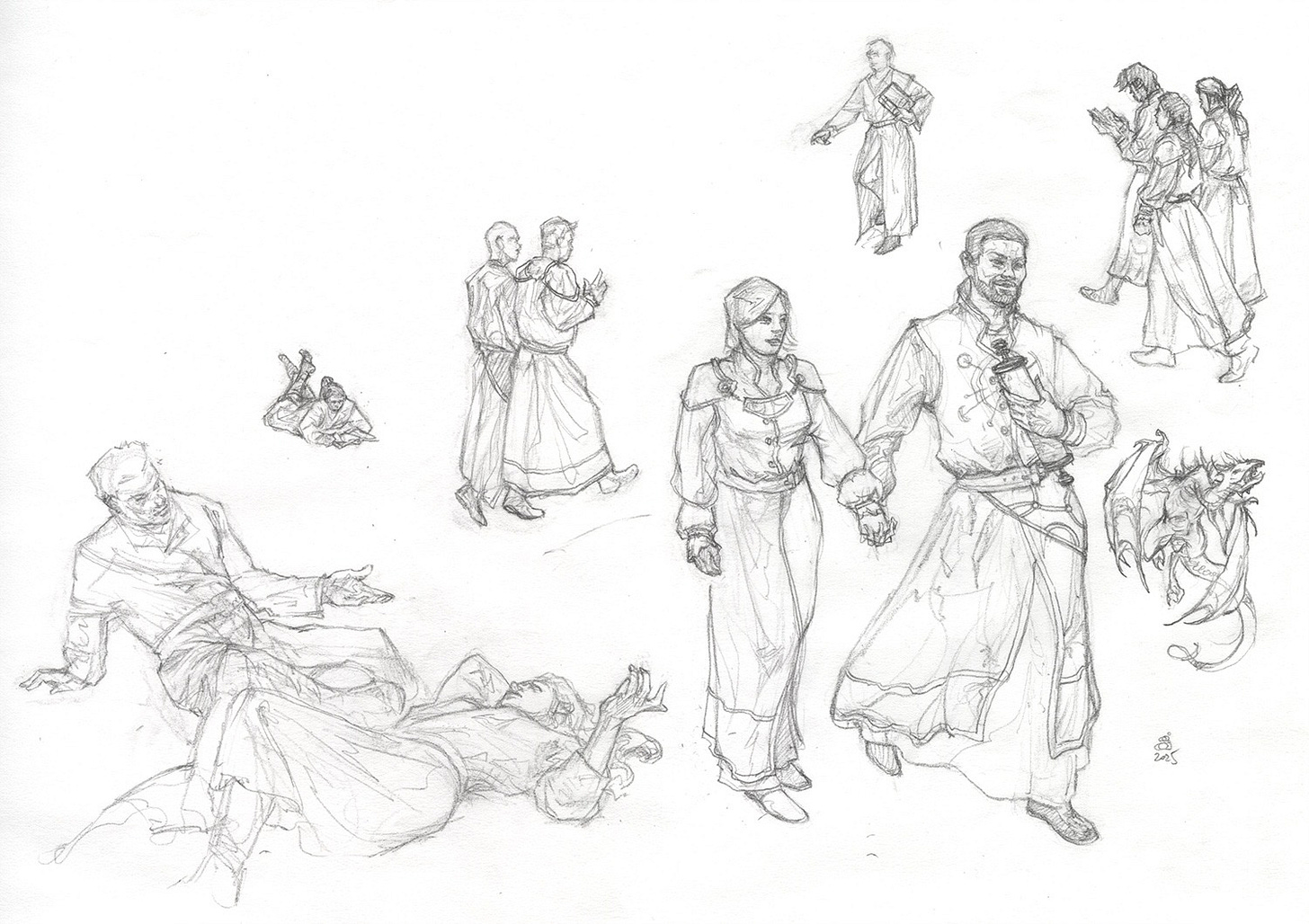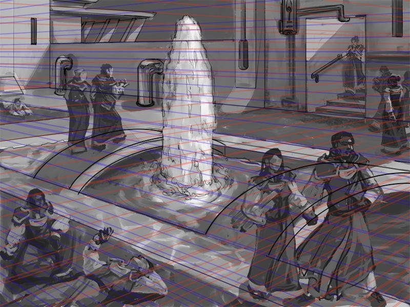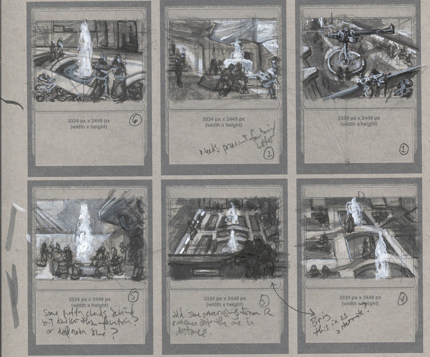 Having worked out the bones of the environment digitally, I printed that out at high contrast and placed a piece of layout paper over it, then drew out the figures at-scale on this one sheet of paper, even if their relative placements aren’t where they would be in the final. After scanning it back in, I moved the elements to where they needed to be for the final composition, before moving to paint.
