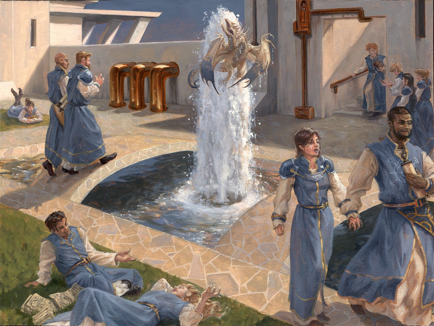 Showing a courtyard of a Tolarian Academy from the Dominaria world/plane was a bit of a challenge. There was the place itself, existing within the transforming city of New Argive, a place heavily structured from concrete, with brass plumbing and infrastructure, and lots of lawns. Then there was the fact this was a university of sorts, and one can't simply portray the place without people.