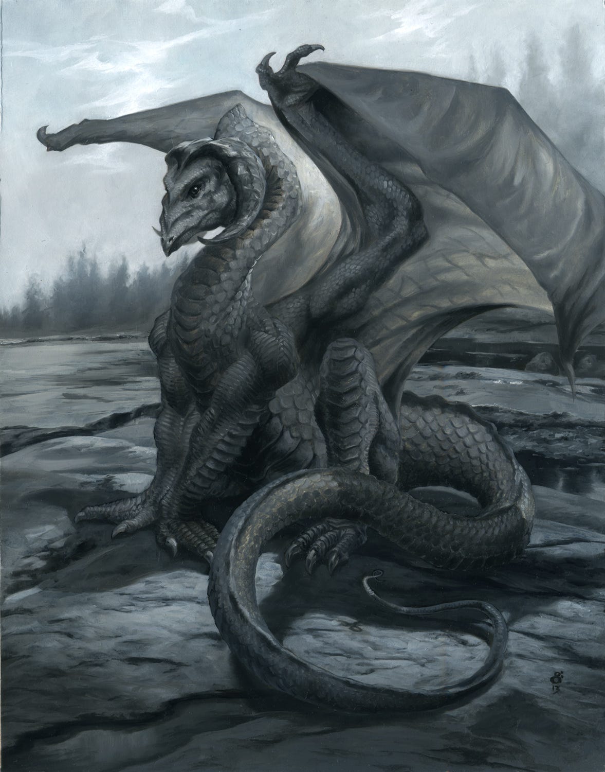 For awhile, this dragon existed painted on just a gray field background. I had painted it in monochrome for use in another project, and then left it sitting around. I scanned the painting in, digitally colored and tweaked it, and put it together with a digital background and it served its purpose, but the painting served no greater use after that.