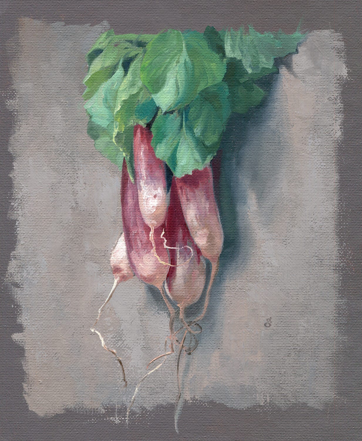 When I was going to paint these radishes, however, we had friends visiting for a few days. Their daughter found it neat that I was going to paint, so after a bit we setup a bean bag for her to sit and watch, which was nice and lasted no more than 10 minutes before she found something more interesting to do. Because watching an artist work, real-time, is not very interesting most of the time. You might get something neat at the end, but minute-by-minute nothing seems to happen.