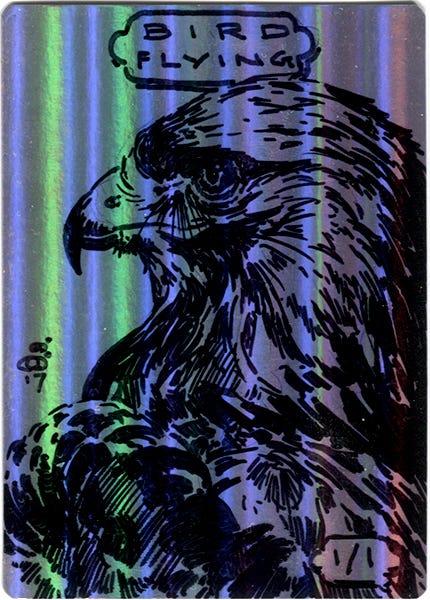 Some years back, at an event, someone brought to me 4 foil cards to draw on. They wanted custom Bird 1/1 tokens to use in playing Magic, and asked if I could draw on them. My recollection is he had stripped the front or back off actual Magic cards, leaving the foil layer underneath the ink untouched.