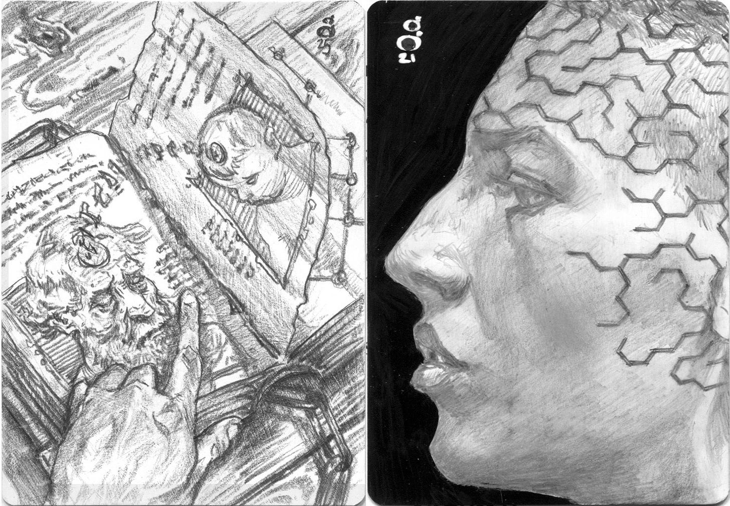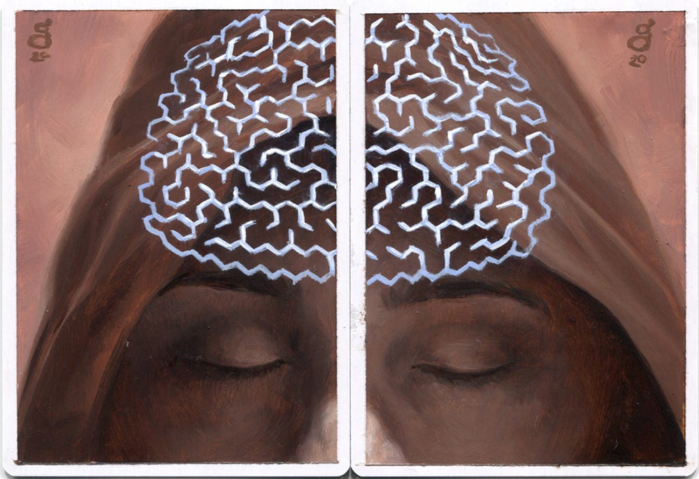 In this second set, the left-side image more clearly shows the mind transfer procedure. Poor kid. The hex-maze pattern on the right lightly runs behind the painted version of the illustration’s background, and itself is also a solveable maze if you could see it at large size.