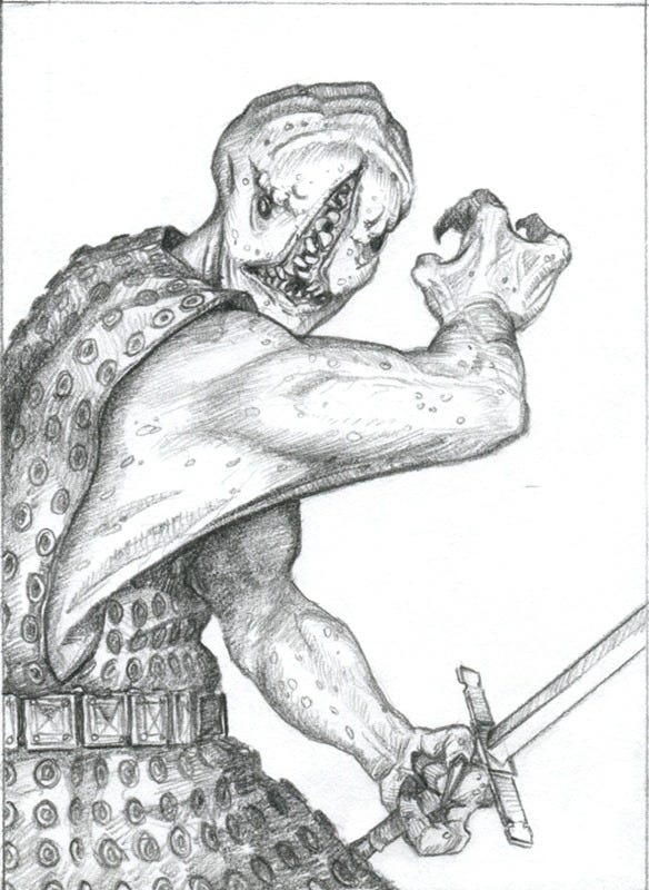 I worked on precisely one project with them, which was for a few black-and-white interior illustrations for some roleplaying game or other. I couldn’t tell you with because it was a long time ago and I don’t even know if I ever got contributor’s copies! I present three of these for this month’s Sketch Gallery.