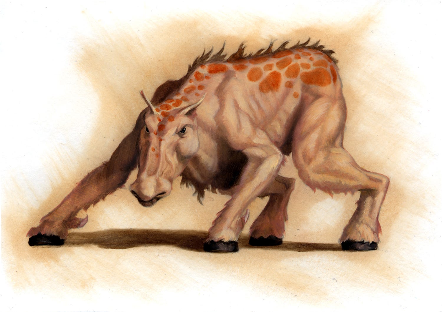 It has strong rear legs which enable it to stand on its hind legs to reach high into trees, and long front legs to keep it from needing to do so often, rather than a giraffe’s elongated neck, which can also get the job done for reaching high. My first attempt at a sketch showed it reaching up and leaning onto a tree as it seeks out sustenance higher up still.