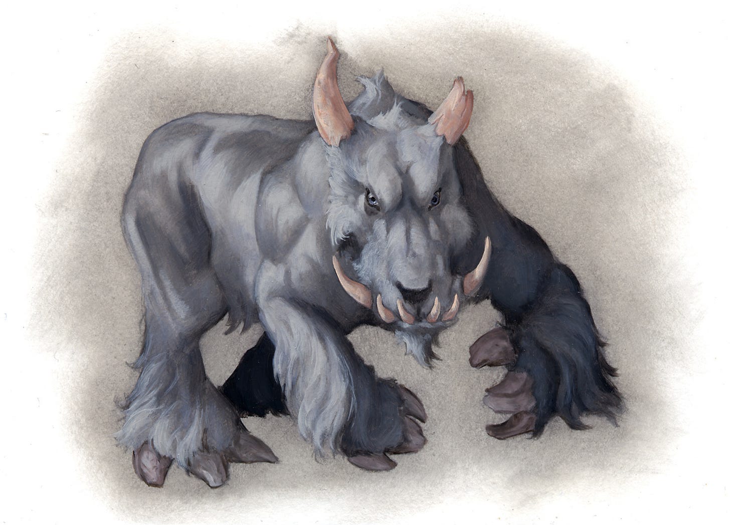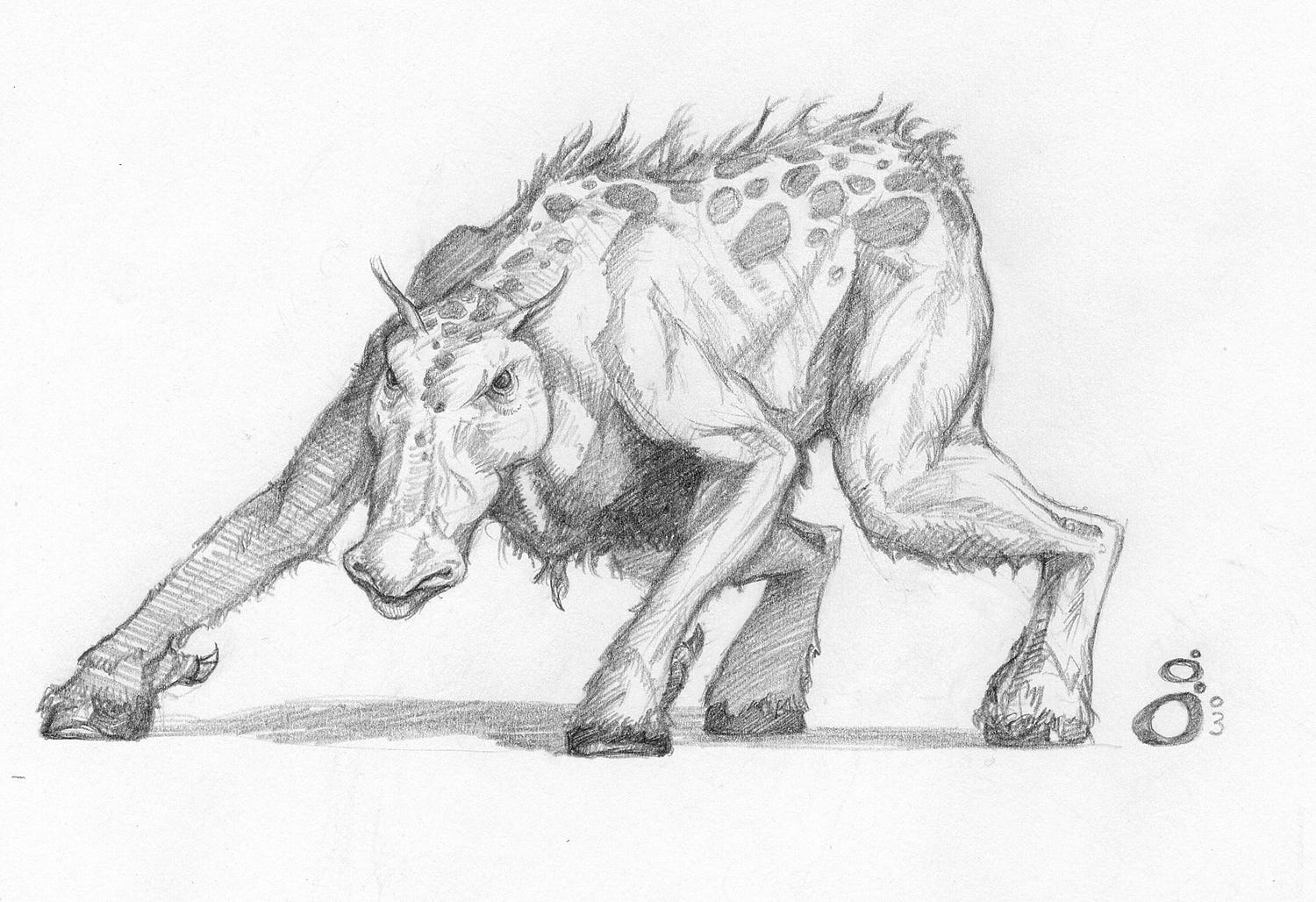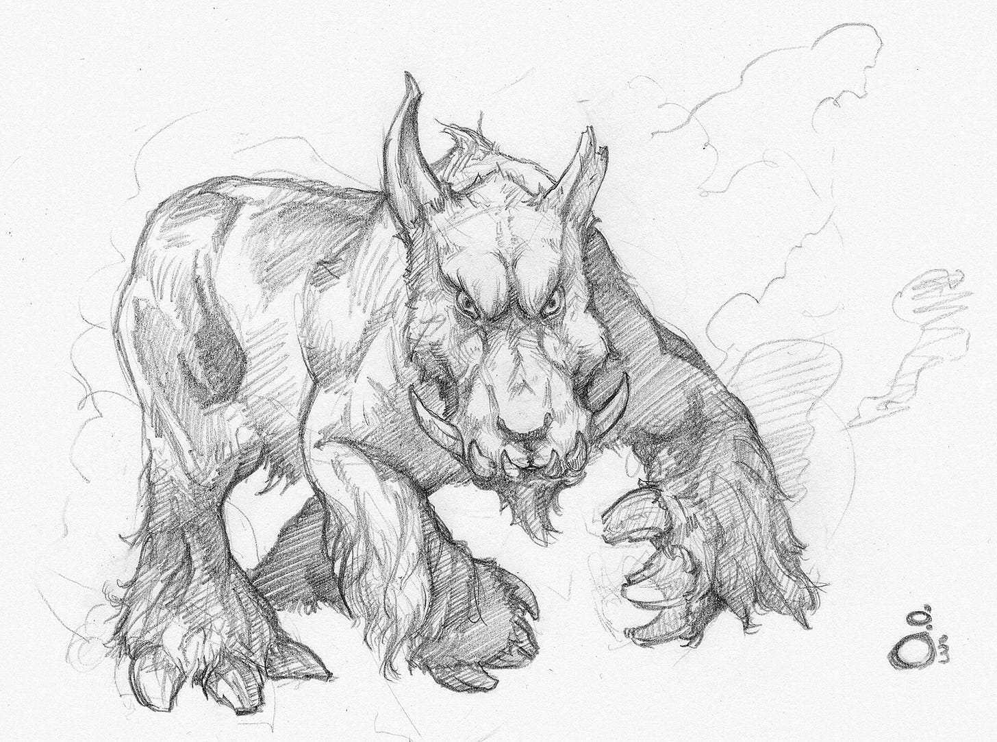 I don’t recall anymore how many of these world-building details were given to me or what. I I think it was the case that they preferred a more straight on and aggressive portrayal, so I decided to redraw the creature in a hunched pose which altered its anatomy somewhat. It was the better sketch, certainly.