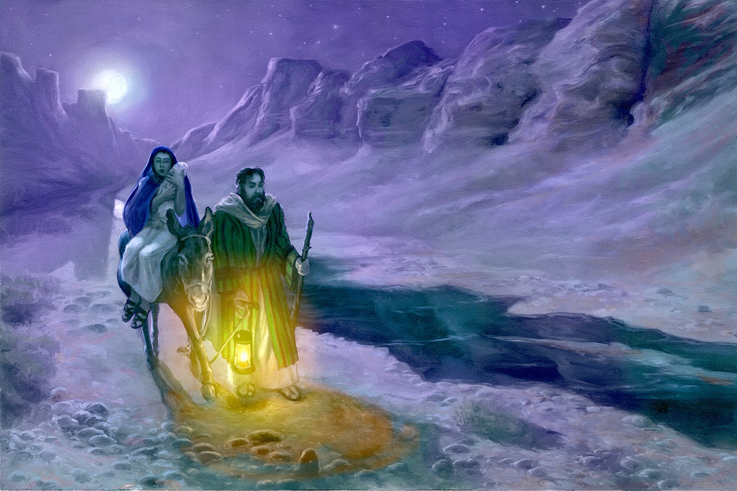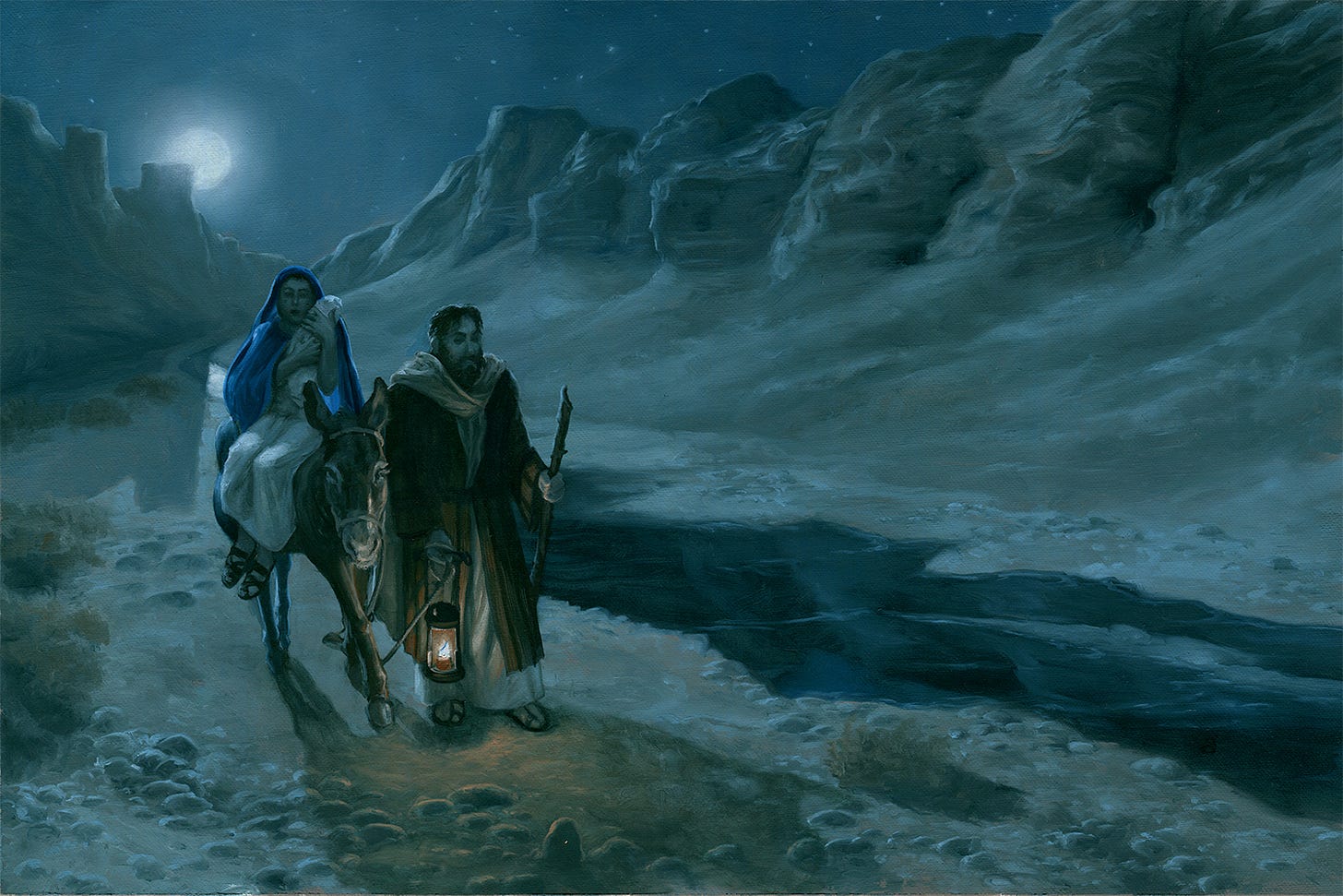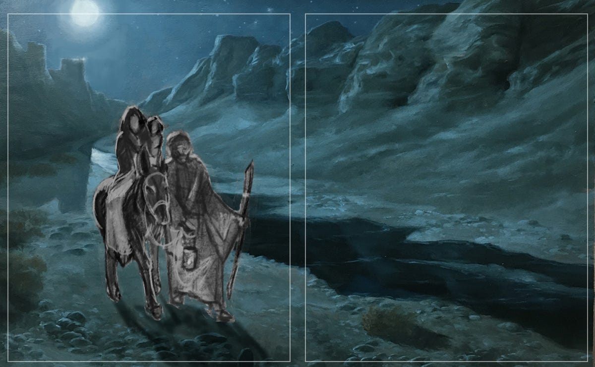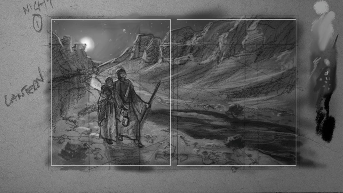 The establishing shot here gave us a sense of the who and where of the story: in this case Mary, Joseph and baby Jesus during their flight to Egypt. And a donkey—we’ll return to him in a second. The majority of the book would be closer-in on all the figures, so this was the one chance to pull the camera out and gain a sense of the environment more.